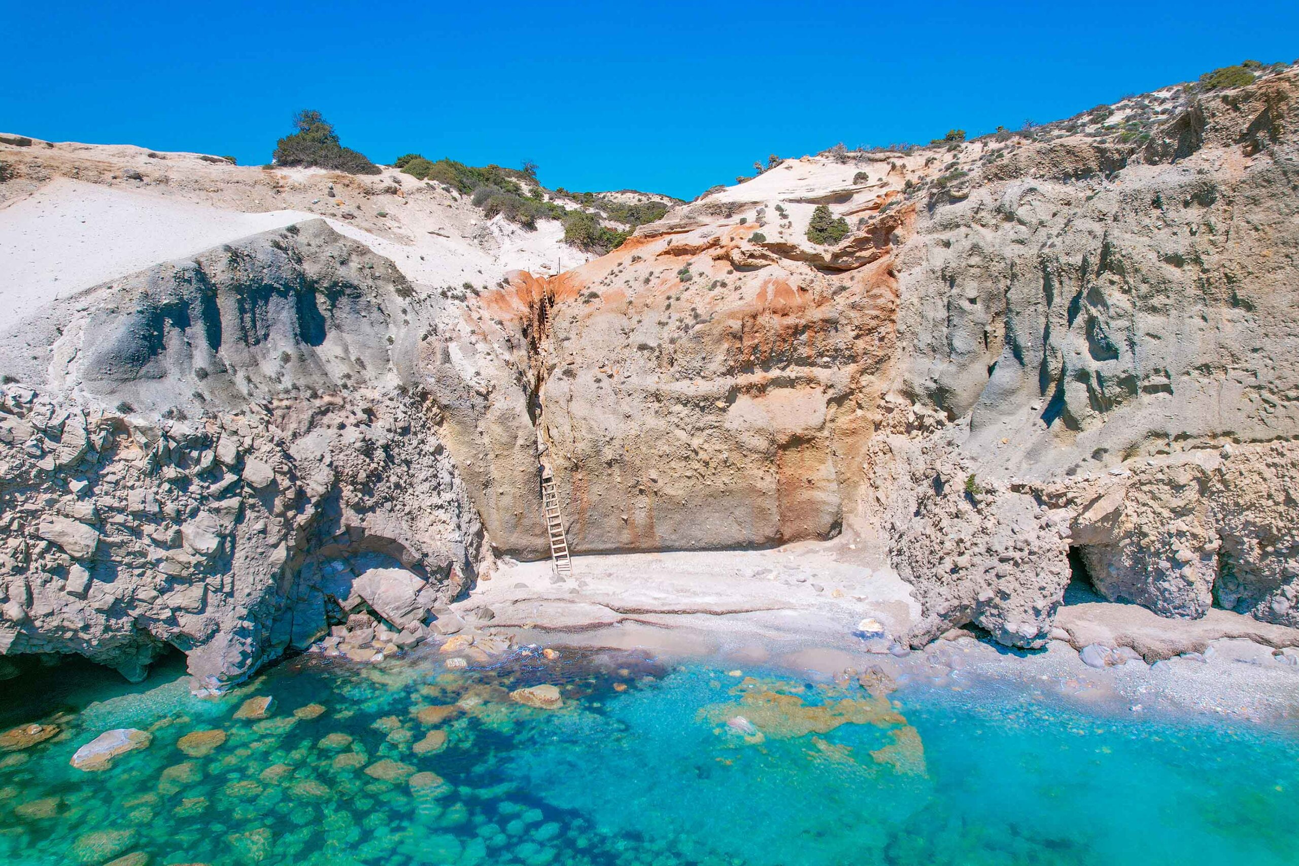 La plage de Tsigrado Beach est certainement l’un des sites naturels les plus aventureux de Milos. Ce lieu unique se trouve au sud de l’île et est accessible en voiture ou même en bus public. La descente vers la plage nécessite toutefois une certaine dose de courage et d’habileté. En effet, la baie n’est actuellement accessible que par une crevasse, où deux échelles en bois et une corde mènent à la mer. Une fois en bas, on est récompensé de ses efforts par une petite baie de rêve dans un décor particulièrement spectaculaire. Les couleurs turquoise de la mer sont divinement belles et créent, avec les rochers rougeâtres, un panorama époustouflant.