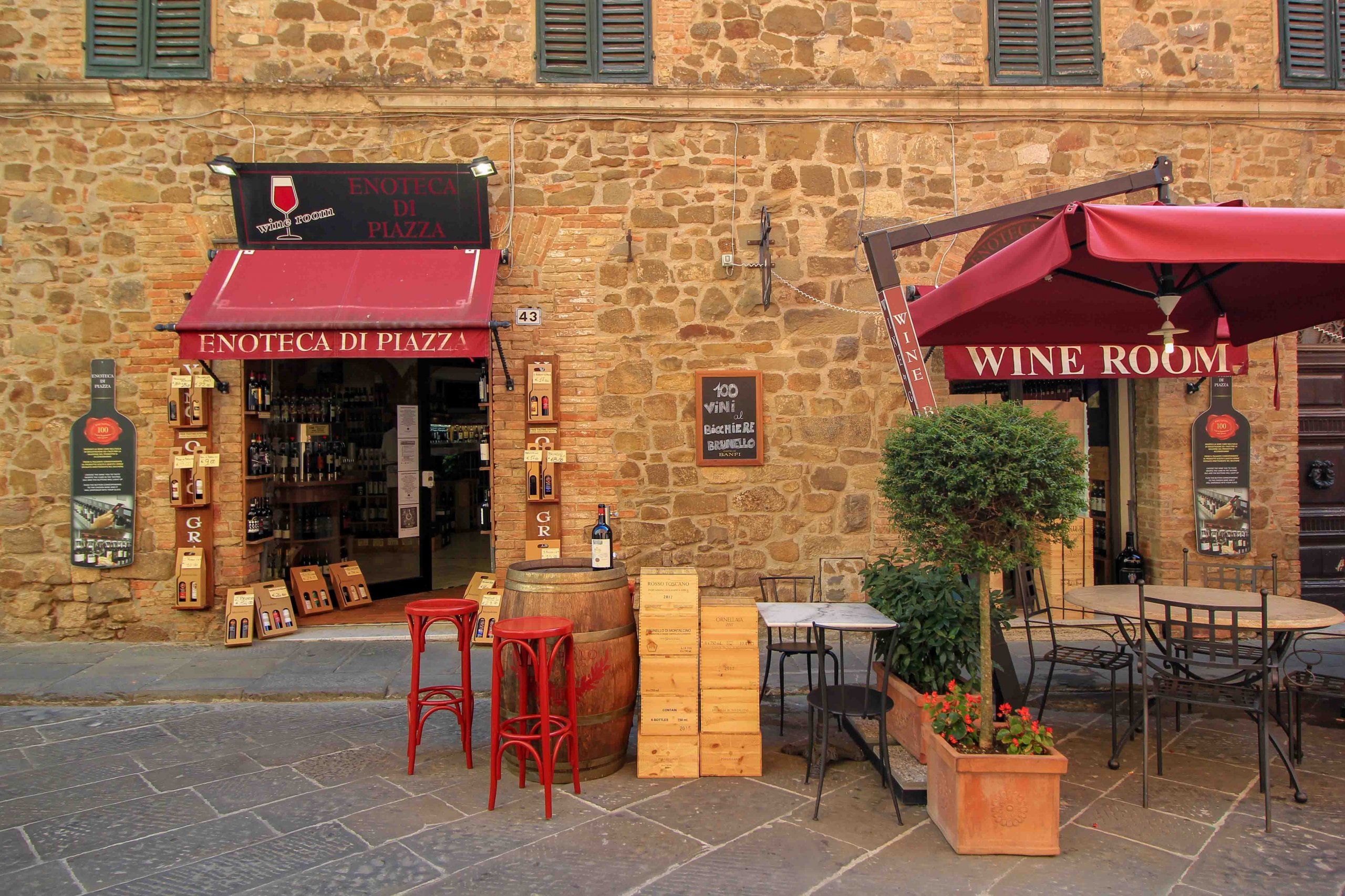 Conseil : à Montalcino, nous vous recommandons de visiter l’une des œnothèques, un mélange gastronomique originaire d’Italie et composé de cavistes haut de gamme, d’épiceries fines et de salles de dégustation.