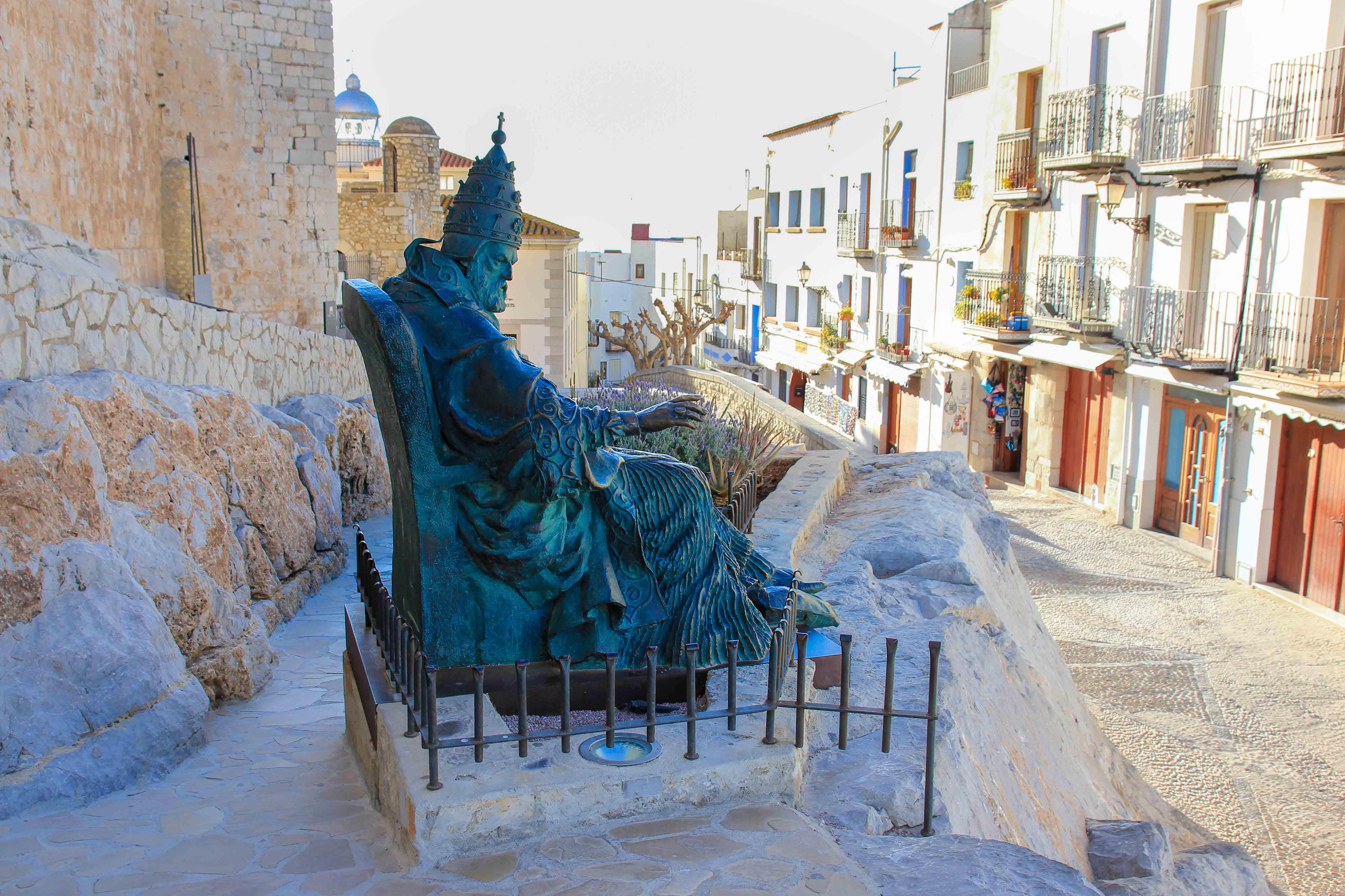 Devant le château se trouve la statue grandeur nature de Papa Luna, le pape qui a vécu à Peniscola pendant environ 20 ans. Il y a des boutiques de souvenirs juste en face, et l’entrée du château est également à proximité.