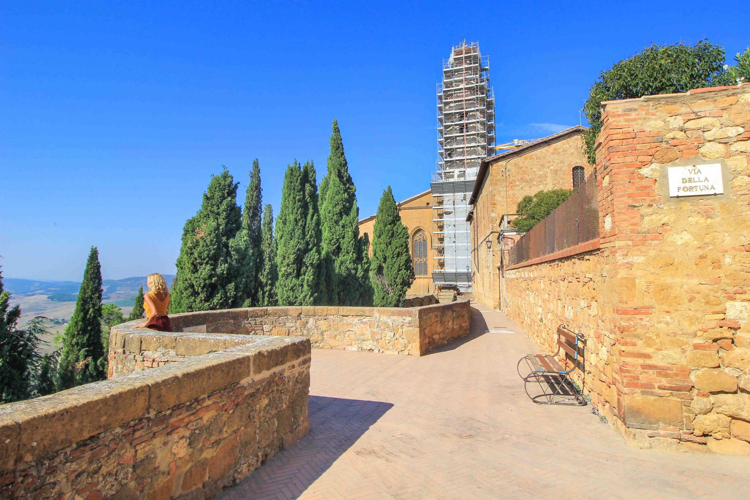 Un panorama magnifique et une ambiance unique peuvent être appréciés depuis le chemin panoramique de la muraille de la ville, le soi-disant « Camminata Panoramica« . De là, vous avez une vue fantastique sur la cathédrale d’une part, et une vue pittoresque sur le paysage vallonné toscan du Val d’Orcia d’autre part. Un point de vue très romantique à Pienza, à voir absolument.