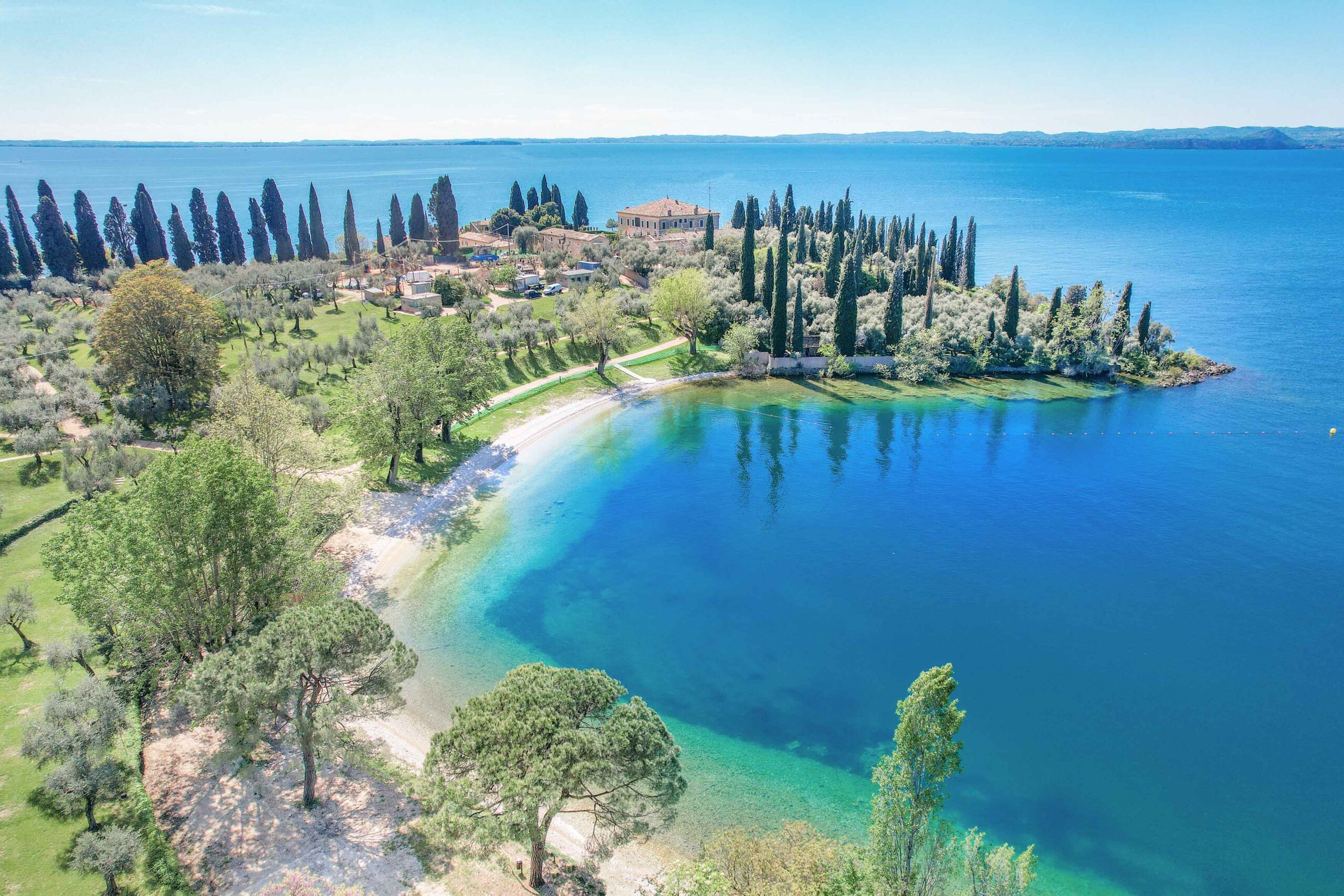 La plage Baia delle Sirene, également appelée baie des sirènes, est une perle absolue et est considérée par les initiés comme l’une des plus belles plages du lac de Garde. Cette baie de rêve se trouve au nord de la localité de Garda et n’est qu’à 4 kilomètres de la ville voisine de Torri del Benaco. Nichée dans un paysage méditerranéen à couper le souffle, cette plage de galets fait partie de la péninsule verdoyante de Punta San Vigilio, où une villa historique du 15ᵉ siècle attire aussi des touristes du monde entier. Pendant les mois d’été, on y trouve aussi une élégante plage avec des chaises longues et des parasols entre les nombreux oliviers.