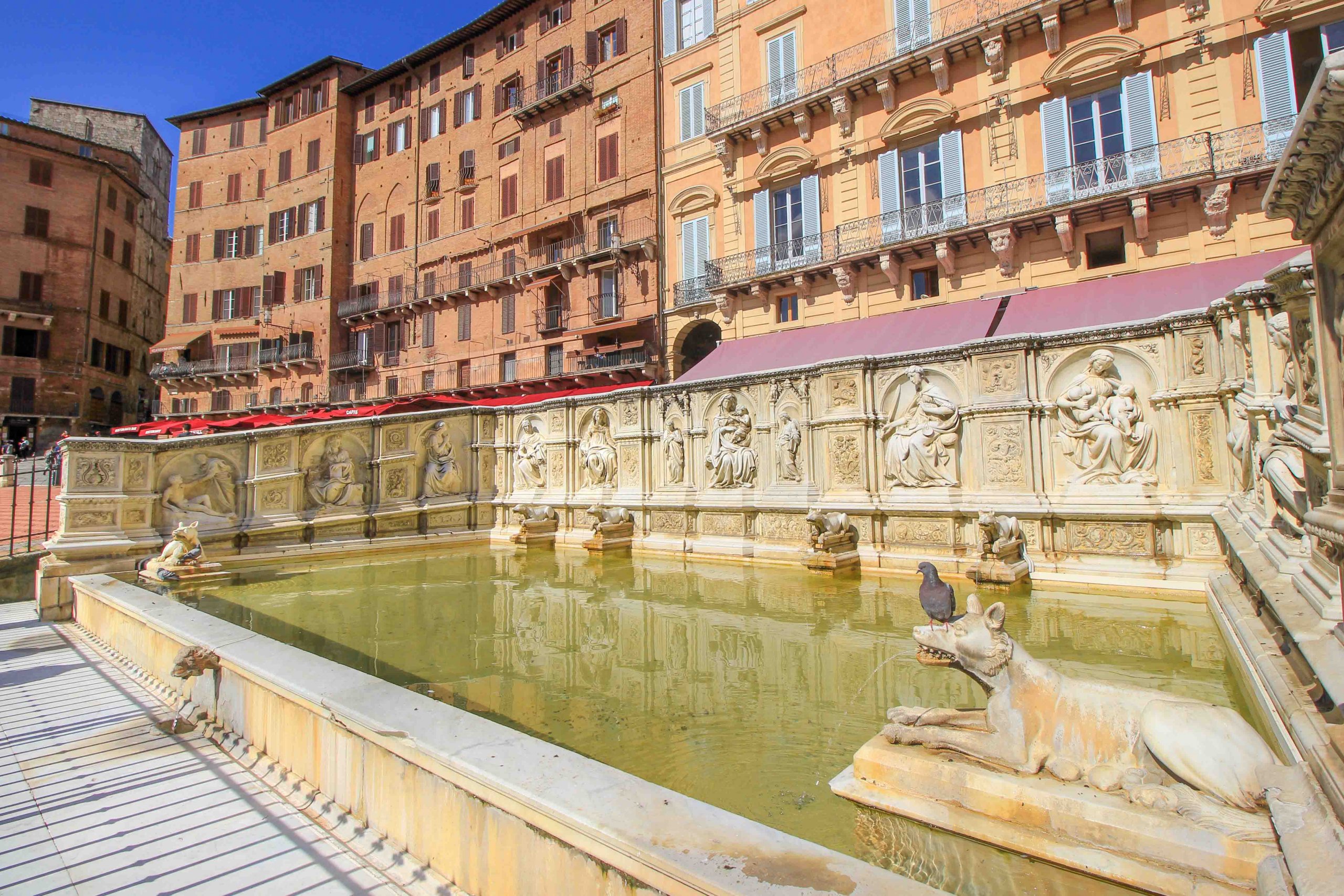 Un autre petit point fort de Sienne et également un lieu de photo très populaire est la belle fontaine Fonte Gaia sur la place Piazza del Campo. La soi-disant « fontaine de la joie » a été construite en 1419 par Jacopo della Quercia, les personnages étant remplacés par des répliques en 1858. Les sculptures originales en marbre peuvent désormais être admirées dans le musée en face de la mairie. Elle doit son nom à la joie des habitants de la ville lorsqu’ils ont vu l’eau jaillir du puits pour la première fois. Jusqu’à présent, Sienne, située sur une colline, a toujours souffert d’un manque d’eau.