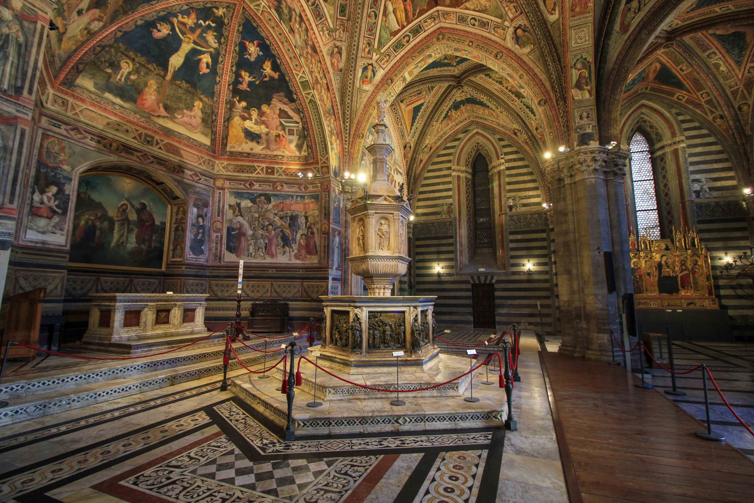 Une autre attraction intéressante à Sienne est le baptistère de San Giovanni, le baptistère, qui est situé sur la place du même nom sous la cathédrale. Il a été construit entre 1316 et 1325, la façade inachevée datant de la seconde moitié du 14ᵉ siècle. L’intérieur du baptistère vaut le détour, où il y a quelques œuvres importants. La pièce maîtresse ici est certainement les célèbres fonts baptismaux au milieu, un chef-d’œuvre du début de la Renaissance toscane.