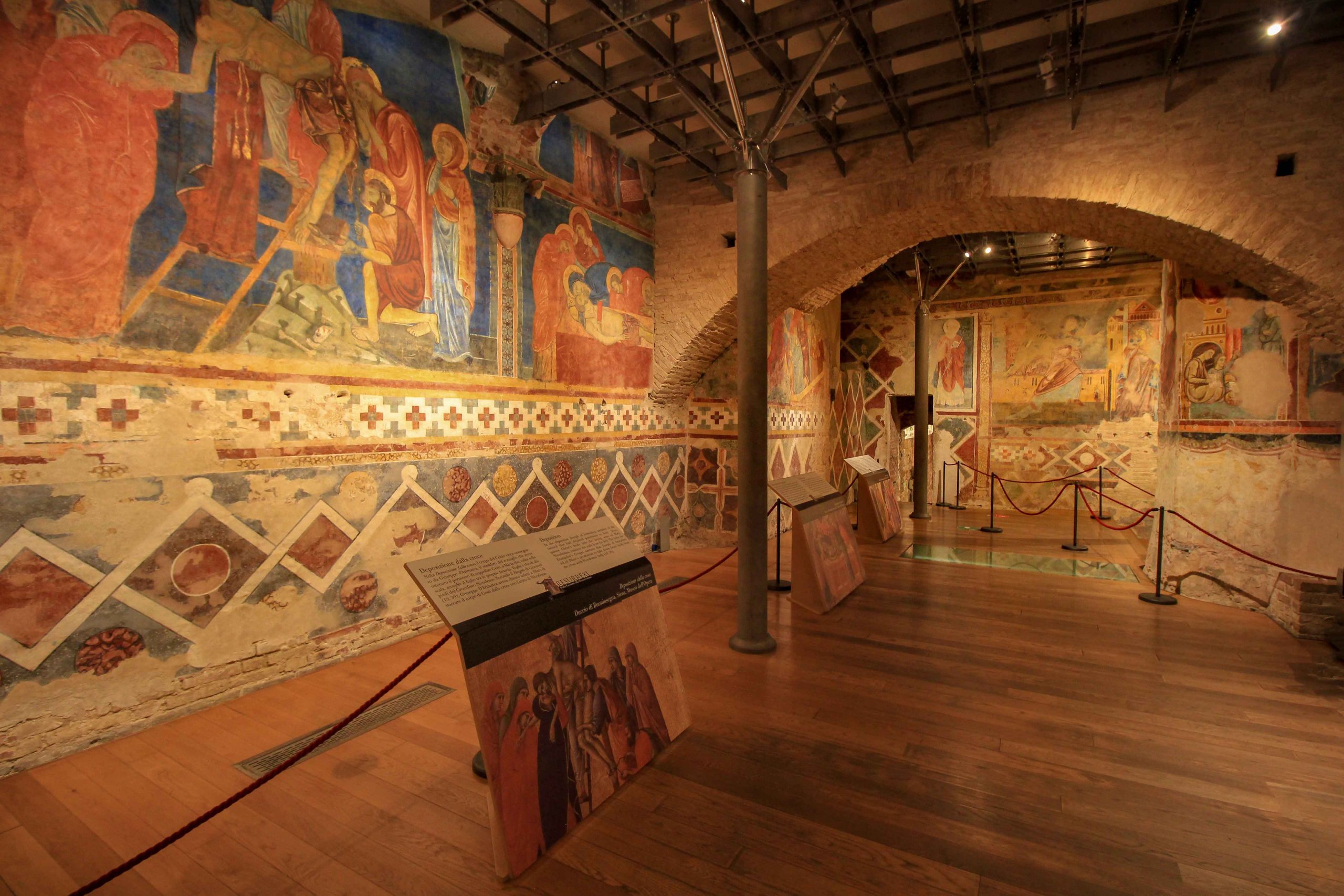 Le Museo dell’Opera della Metropolitana, ou simplement connu sous le nom de musée de la cathédrale, se trouve juste à côté de la cathédrale dans le Duomo Nuovo. Ce musée, qui a été fondé en 1869, est une exposition d’œuvres originales rassemblées de la cathédrale. Ici, par exemple, le travail de Duccio di Buoninsegna est exposé. Y compris la Maestà, le retable qui ornait autrefois le maître-autel de la cathédrale. Mais des peintures impressionnantes telles que l’œuvre d’art Madonna degli Occhi Grossi, l’une des plus anciennes de l’école siennoise, peuvent être vues ici.