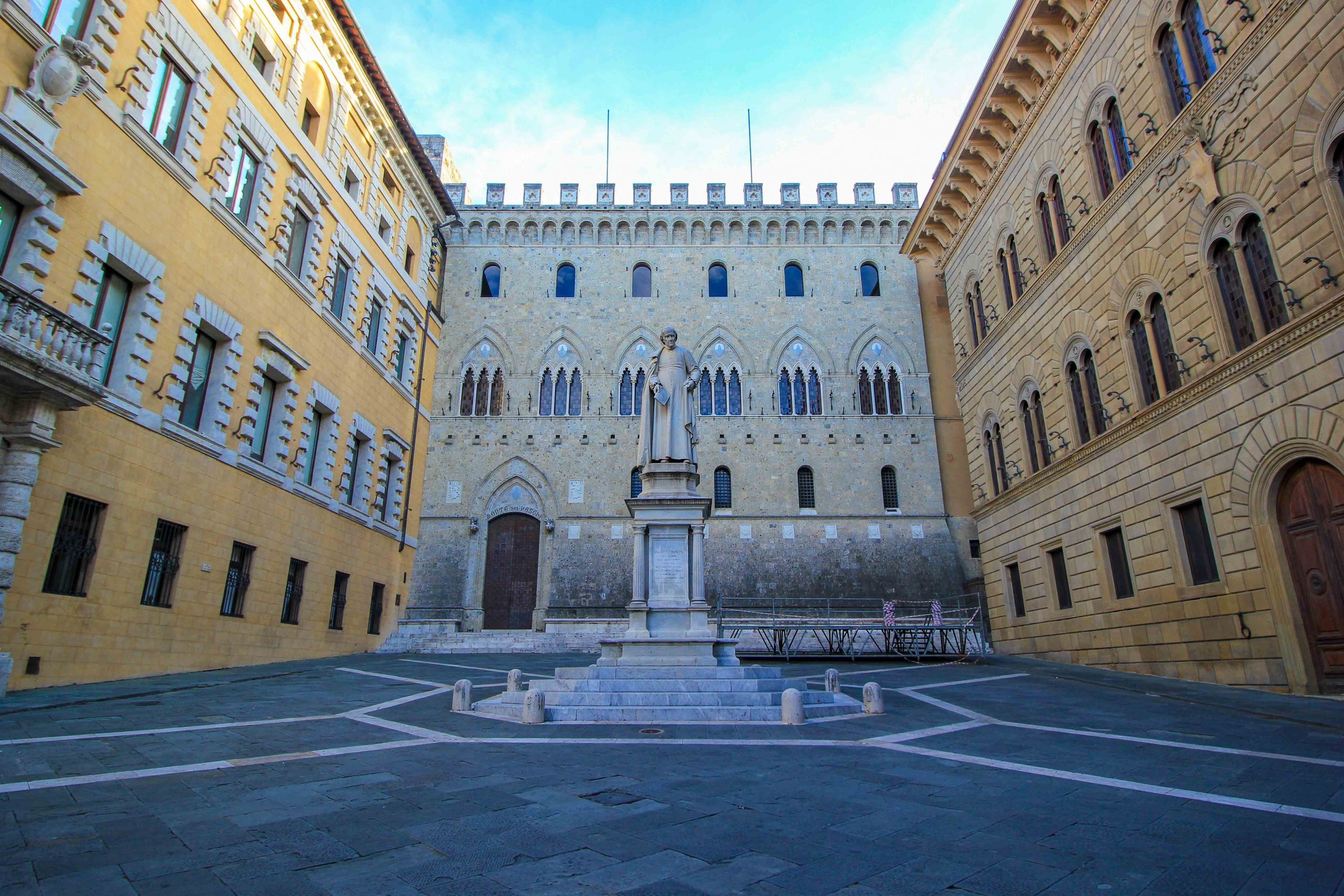L’un des plus beaux endroits et un lieu de photo populaire est la Piazza Salimbeni du XIVᵉ siècle avec le Palazzo Salimbeni du même nom. Ce bâtiment historique abrite le Monte Paschi di Siena, la plus ancienne banque d’Europe, qui est toujours propriétaire de tous les bâtiments autour de la place aujourd’hui. La statue au milieu de la place est également intéressante. Il a été créé par Tito Sarrocchi en 1880 et représente le politicien et économiste Sallustio Bandini.