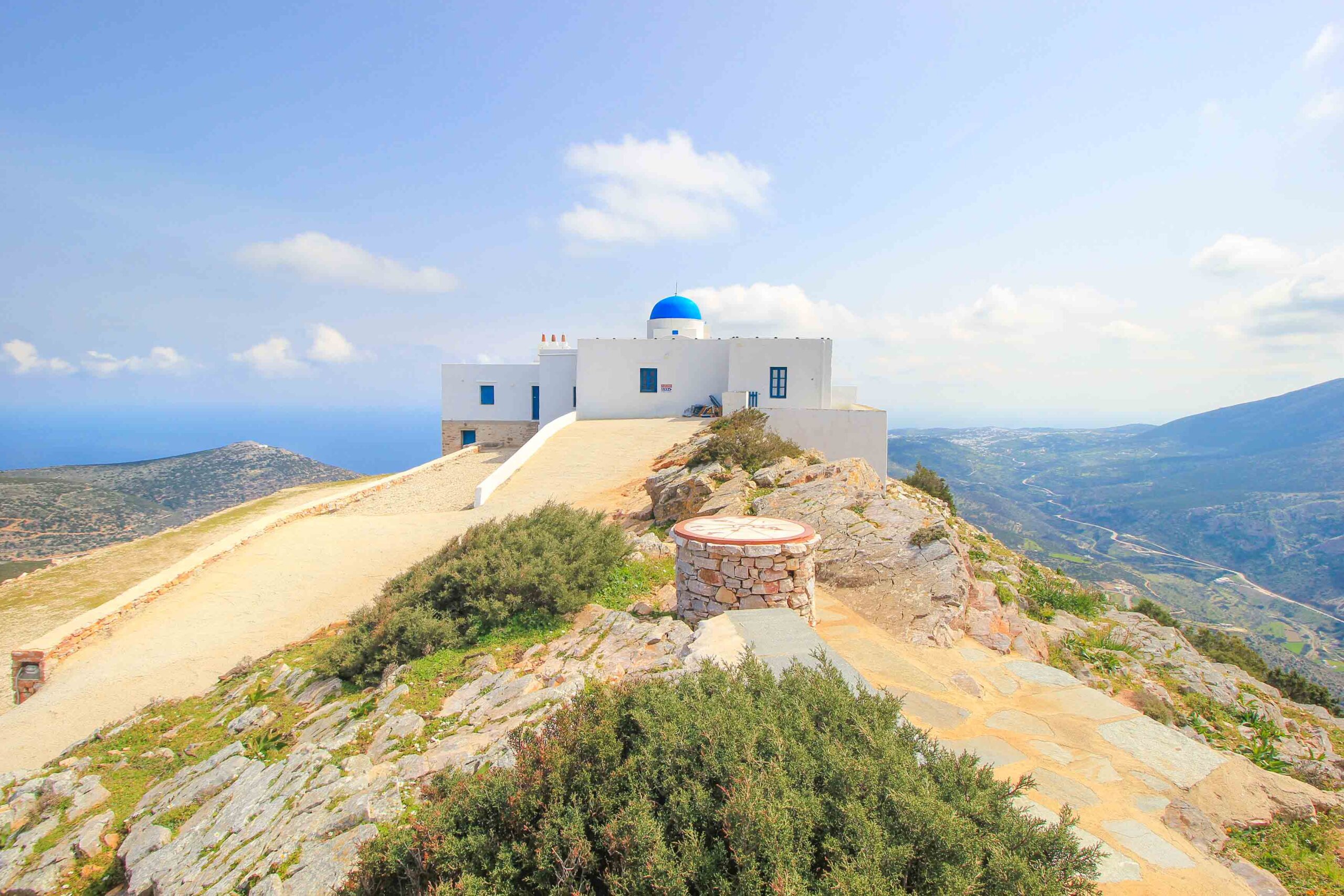 L’un des plus beaux points de vue de Sifnos se trouve au monastère d’Agios Simeon, qui est spectaculairement situé sur une haute montagne au-dessus de la ville portuaire de Kamares et offre un panorama incomparable. L’accès au monastère se fait en voiture, en scooter ou en quad par une route plutôt raide et étroite. Une des raisons pour lesquelles vous ne rencontrez pas trop de touristes ici, mais plutôt des locaux. Alternativement, vous pouvez également partir en randonnée depuis Kamares. La carte en marbre au point de vue est également intéressante, qui donne un aperçu des îles voisines.