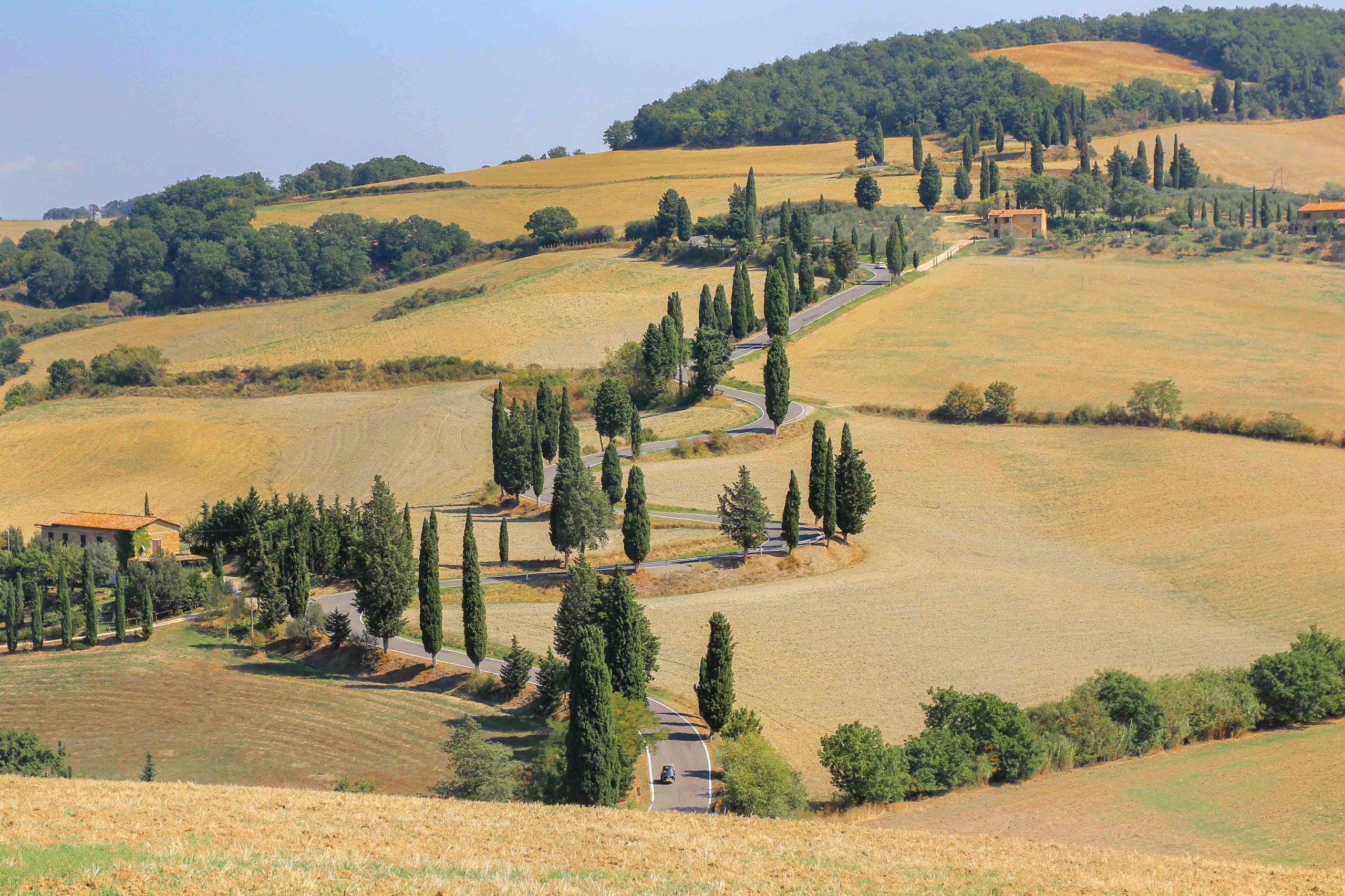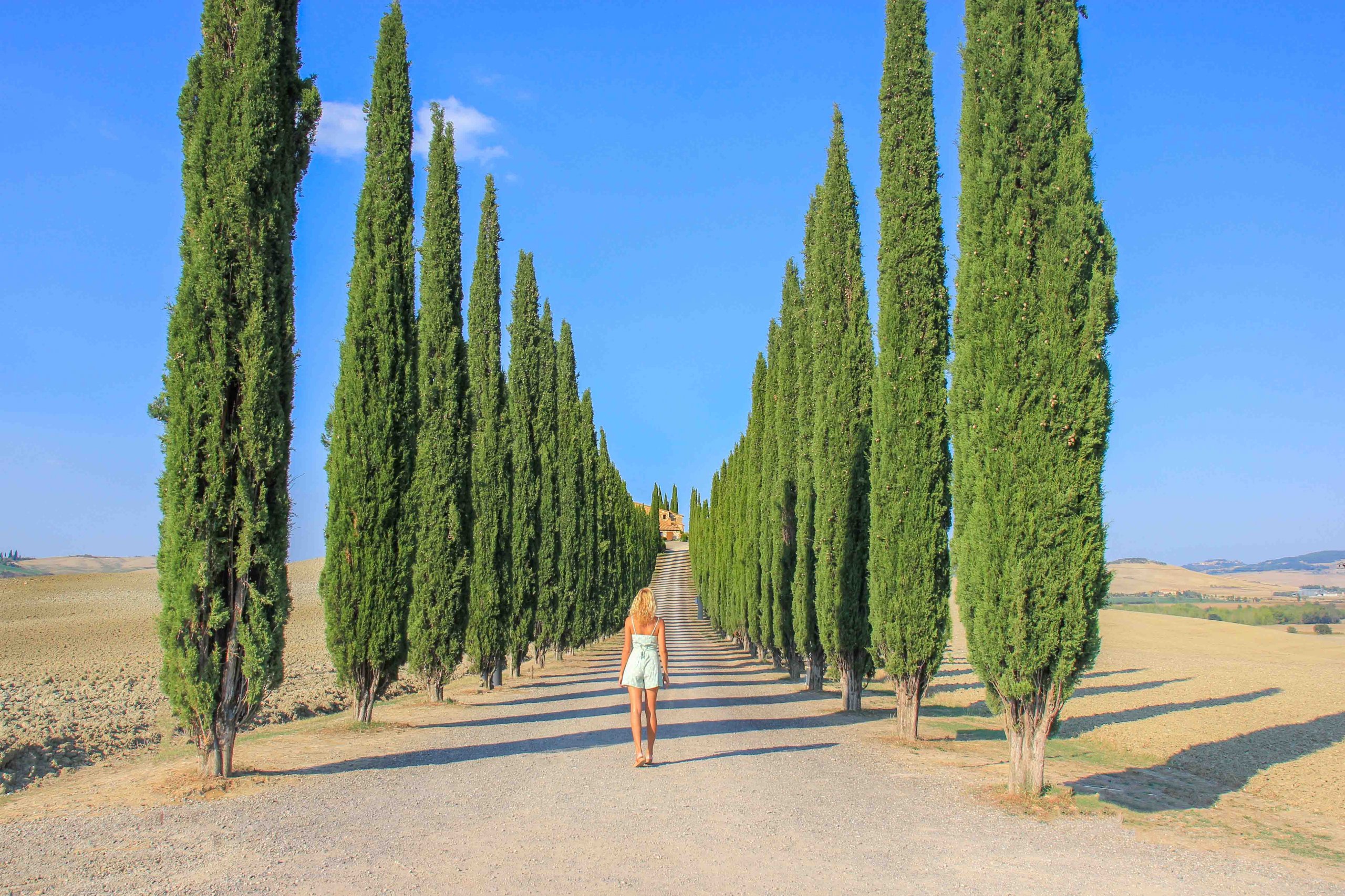 Une autre caractéristique du Val d’Orcia sont les innombrables avenues de cyprès photogéniques qui mènent aux fermes, caves ou propriétés respectives. L’un des spots photo les plus populaires est la longue et pittoresque avenue de la ferme Poggio Covili, située sur la route SR2. C’est là que certaines des photos Instagram les plus cool de la Toscane sont prises. Cette avenue est l’une des plus belles de la région et vaut vraiment le détour si vous explorez le Val d’Orcia en voiture ou à vélo !