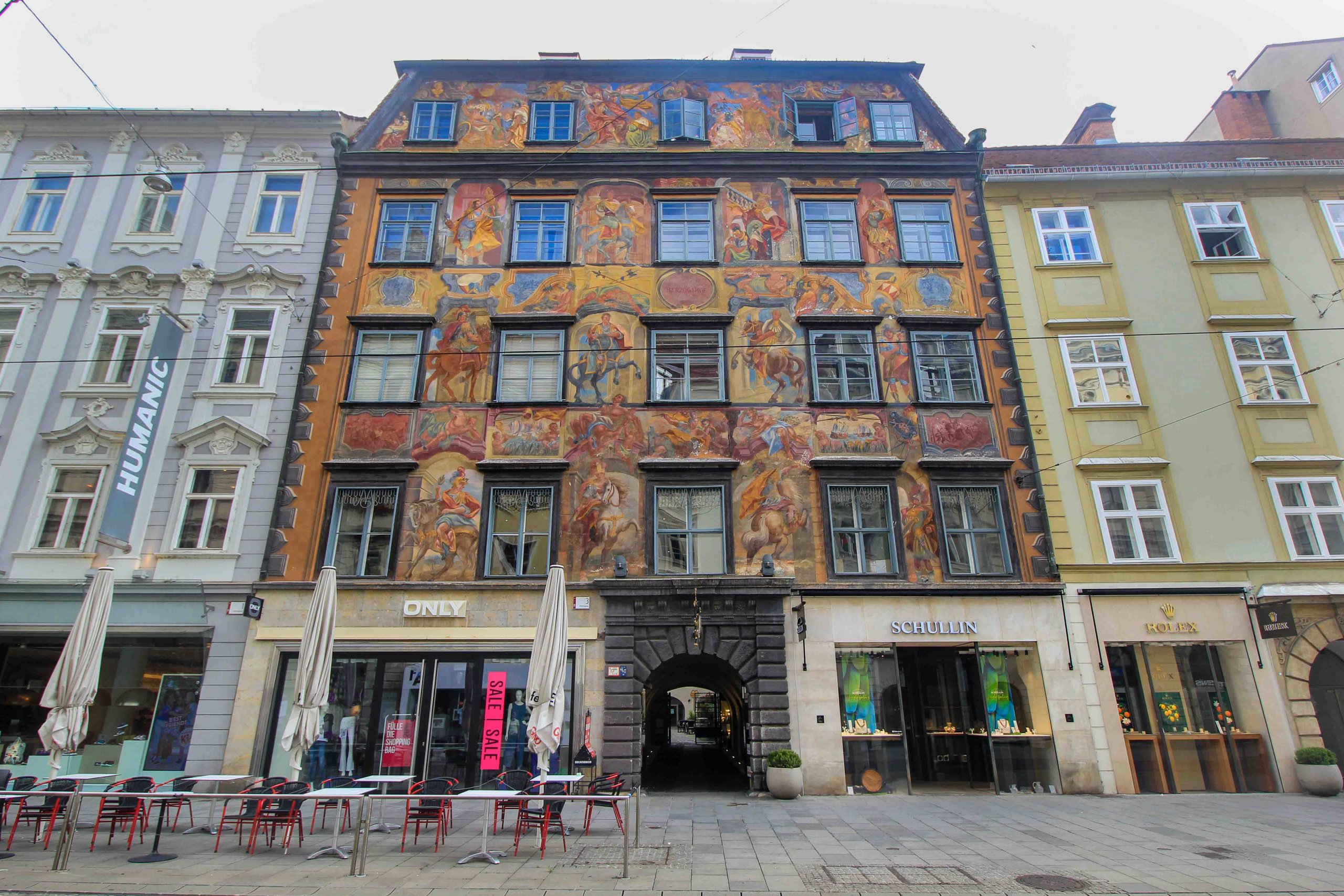 One of the most interesting houses in Herrengasse is the Painted House. It is hard to miss because the entire facade with over 220 m² was artistically painted here. A historical wall tattoo that you should not miss on any trip to Graz.