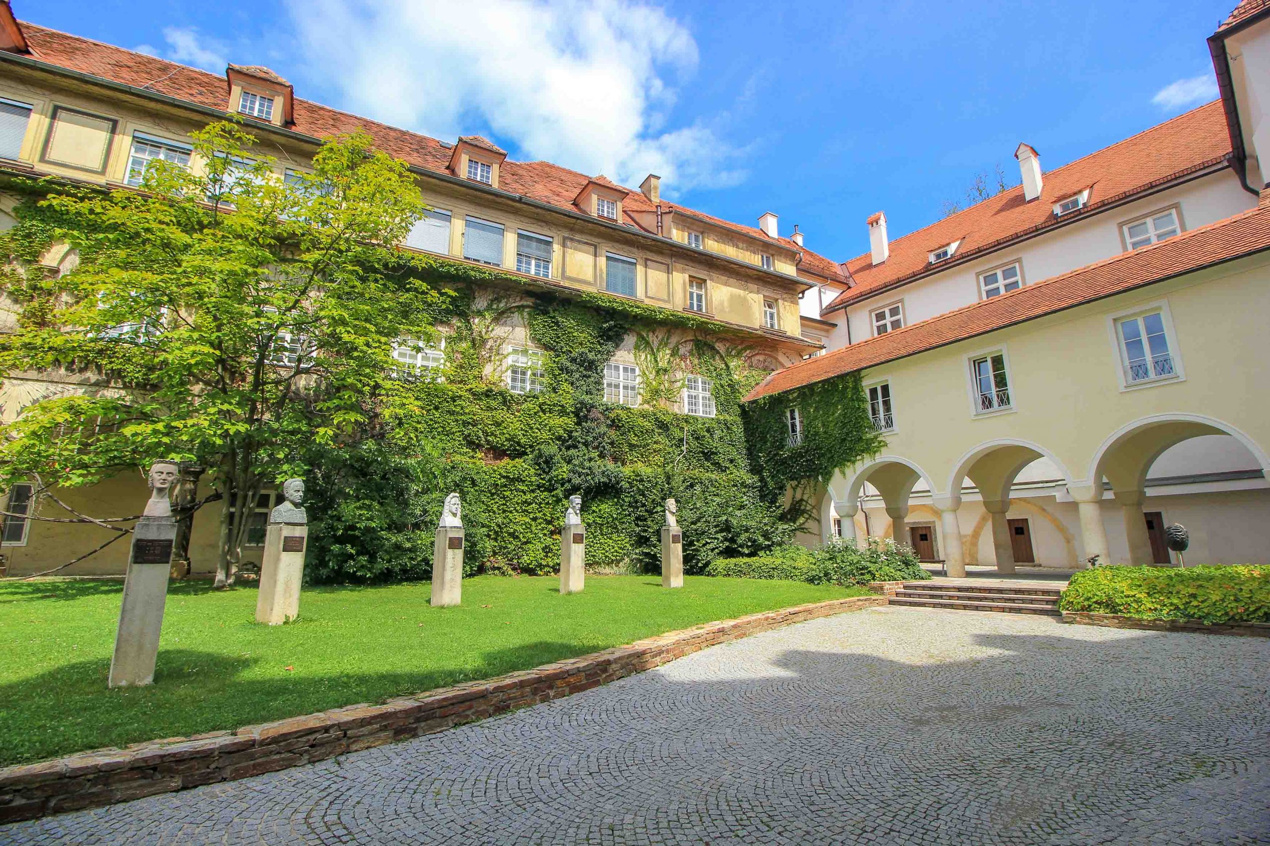 The Landhaushof is the picturesque courtyard of the Grazer Landhaus and moreover a fantastic visitor tip on our list of the best things to do in Graz. Especially impressive is the architecture, with the magnificent arcades of the Renaissance building. The historic fountain and the faun statue are also worth seeing. Gorgeous and a small highlight is the green wooden gate with the Styrian Panther, which has become a popular photo motif.