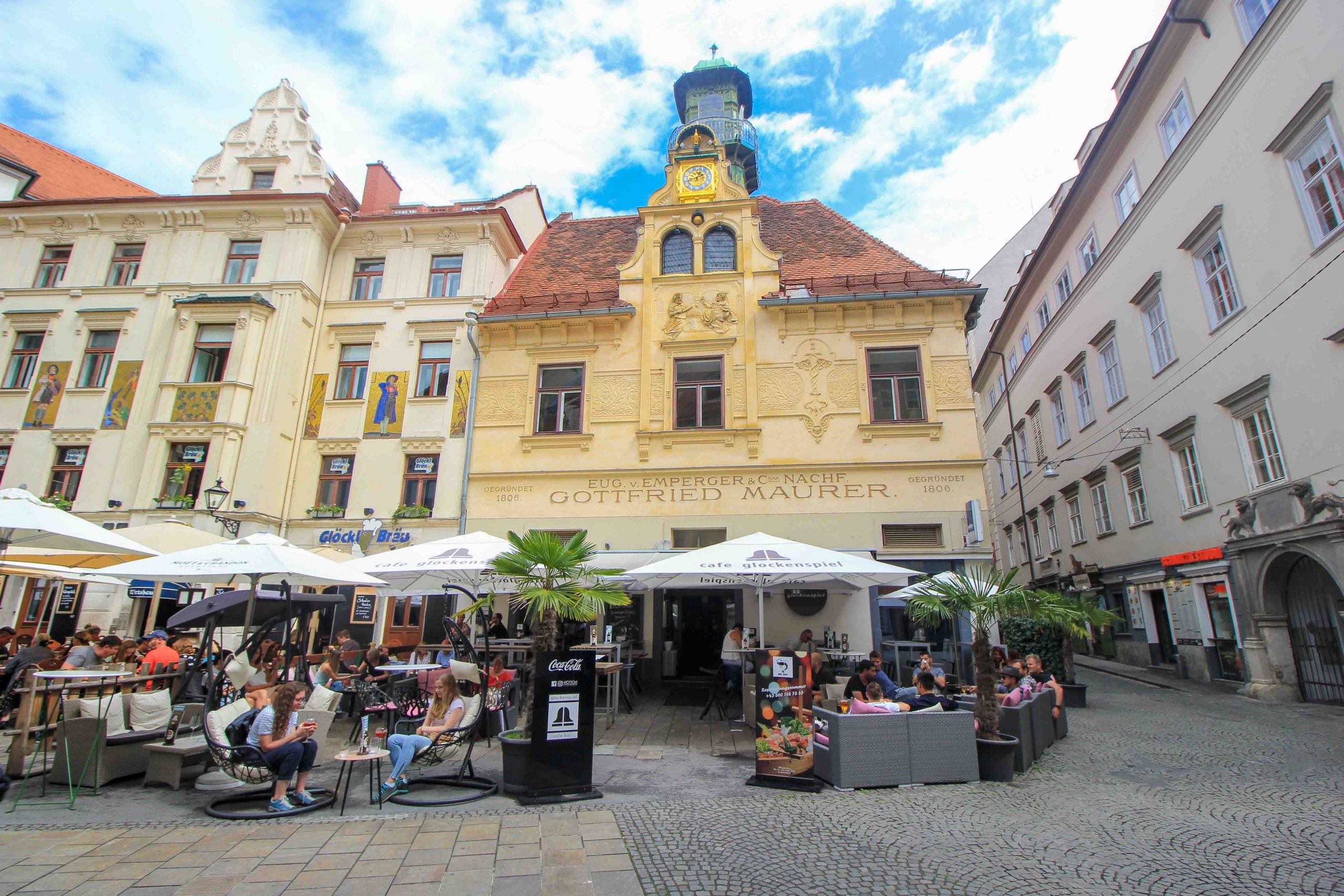 A real insider tip in Graz is a visit to the Glockenspielplatz because here an exceptional spectacle awaits you. Every day, punctually at 11:00 am, 3:00 pm and 6:00 pm, a cute couple of traditional costumed figures appear at the gable of the house and dance to the local carillon. A charming experience, best enjoyed in the cozy cafés and restaurants on the square of the Glockenspielplatz.