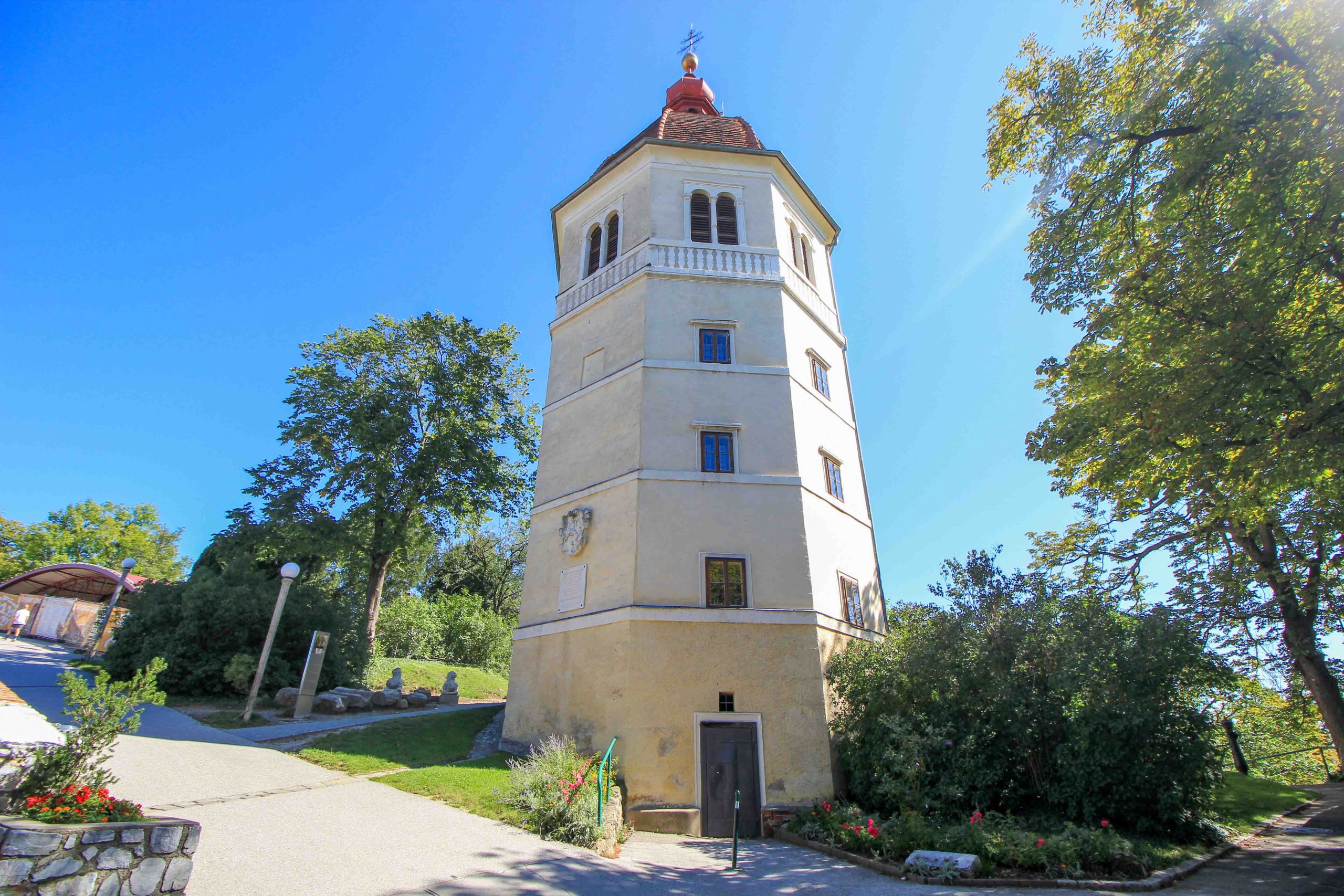 The absolute highlight on the Schlossberg is the 28-meter-high clock tower, the landmark of Graz. It is enthroned above the city and can be seen from many places in the city center. Built in the 13th century, it has had its present appearance since the new fortification in the 16th century. A special feature of this attraction is the clock face because the minute and hour hands are reversed! Amazingly beautiful is also the park with its pretty flowerbeds, which is located directly beneath the tower.