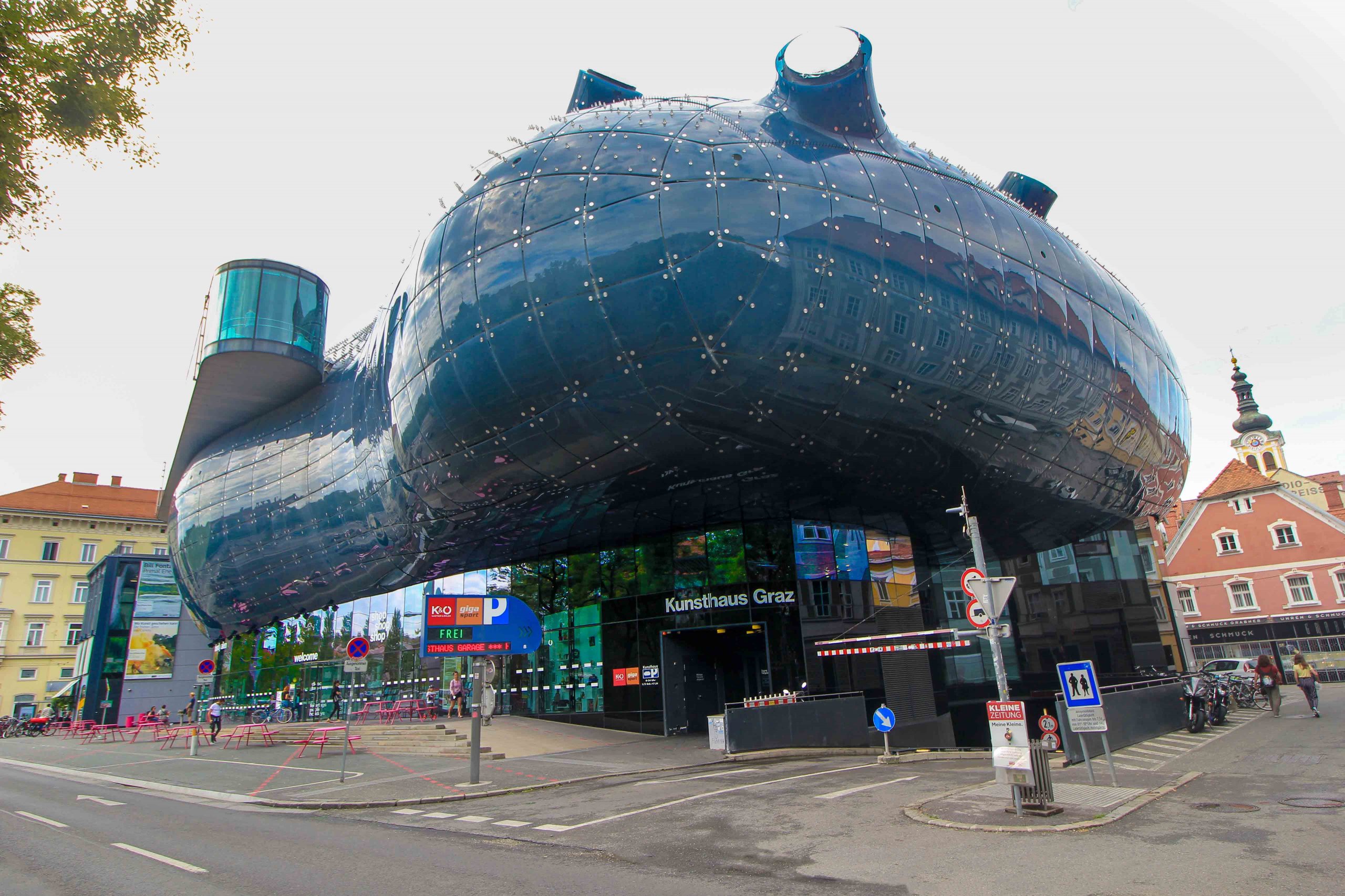 The Kunsthaus (Art House) is one of the city’s landmarks. This futuristic building was erected in 2003, the year of the Capital of Culture, and has been a popular tourist attraction in Graz ever since. Many visitors compare it to a human heart, others recognize it as a spaceship, and its creators lovingly refer to it as “friendly alien”. The museum hosts various art exhibitions. Also the viewing platform on the top floor is really cool, from where you can enjoy a nice view of the old town of Graz and over to the Schlossberg.