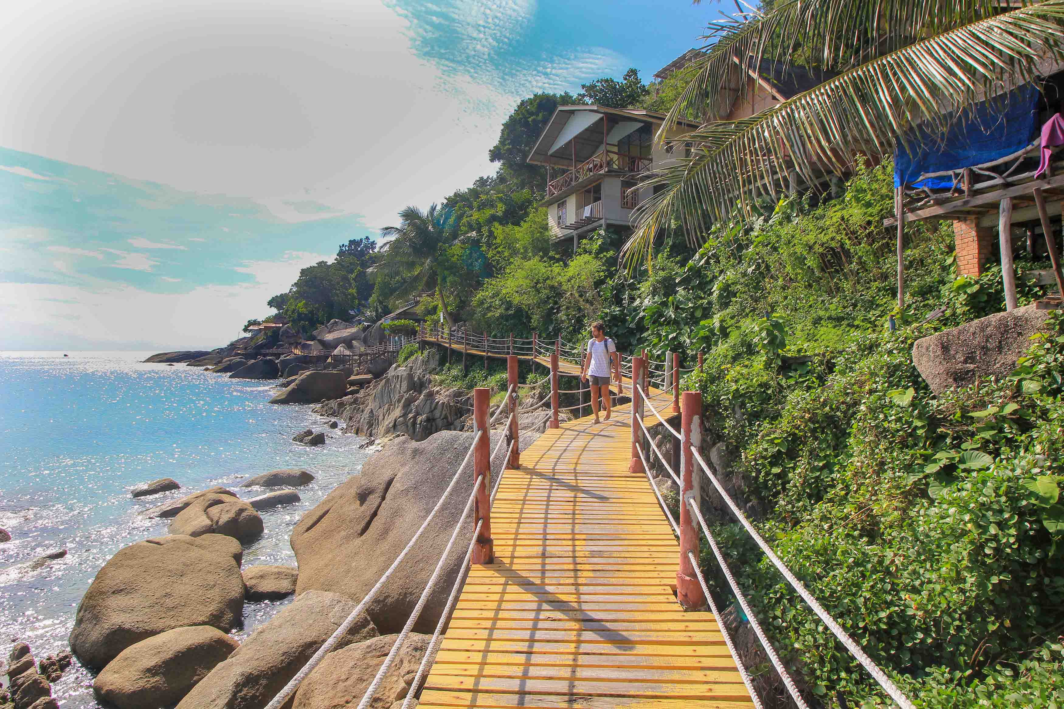 The vibes on the beach are really pleasant and relaxed. Here you can linger forever, enjoy the view and the white sand. Absolutely charming! Furthermore, if you have the feeling you want to get more active, you could rent a kayak and visit the neighboring beach Haad Tien. Also, for snorkeling, the Haad Yuan offers some nice reefs just 100 meters away. The most beautiful view you will get from the wooden bridge located at the end of the beach. Especially the rock formations and the almost unbelievable turquoise blue sea colors make this beach so extraordinary.