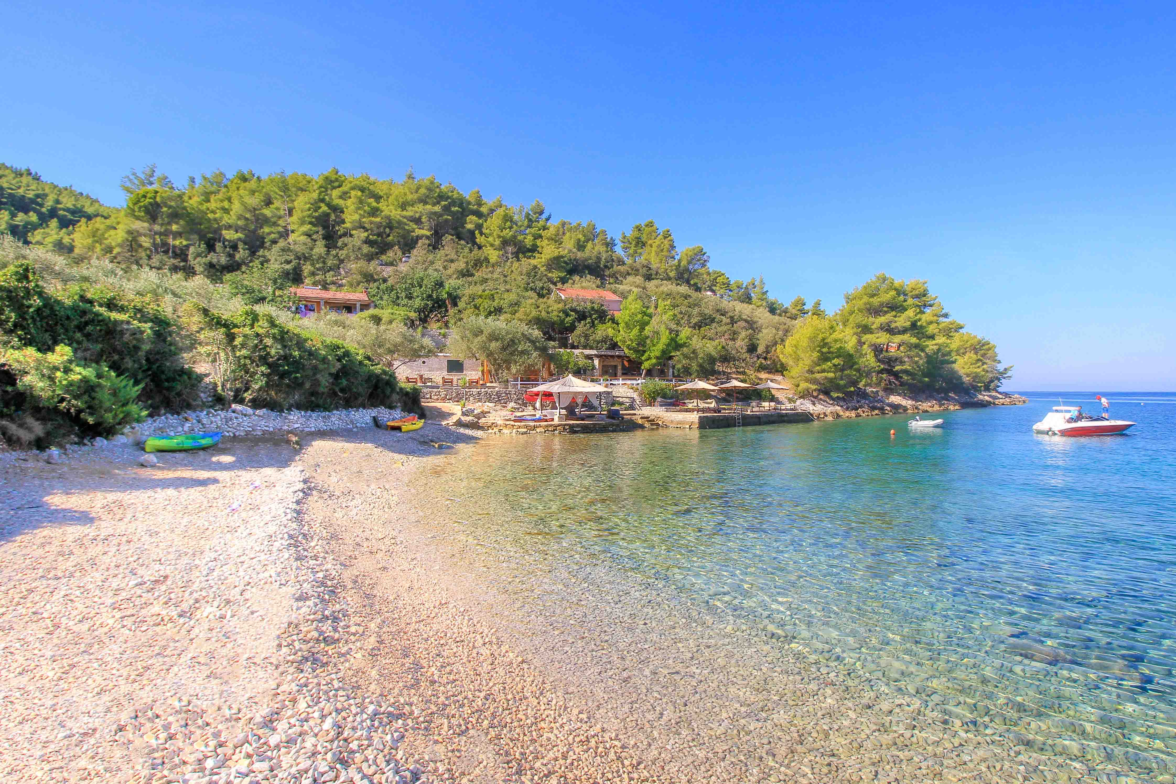 One of the most beautiful beaches of Korcula and meanwhile a real attraction is Pupnatska Luka. This idyllic dream beach is located on the south coast of the island and is about 15 kilometers from Korcula town. Picturesquely surrounded by dense forests, this bay delights with unique blue sea colors and a very fine, clean pebble beach. A real beach jewel, which you should not miss during your vacation on Korcula.