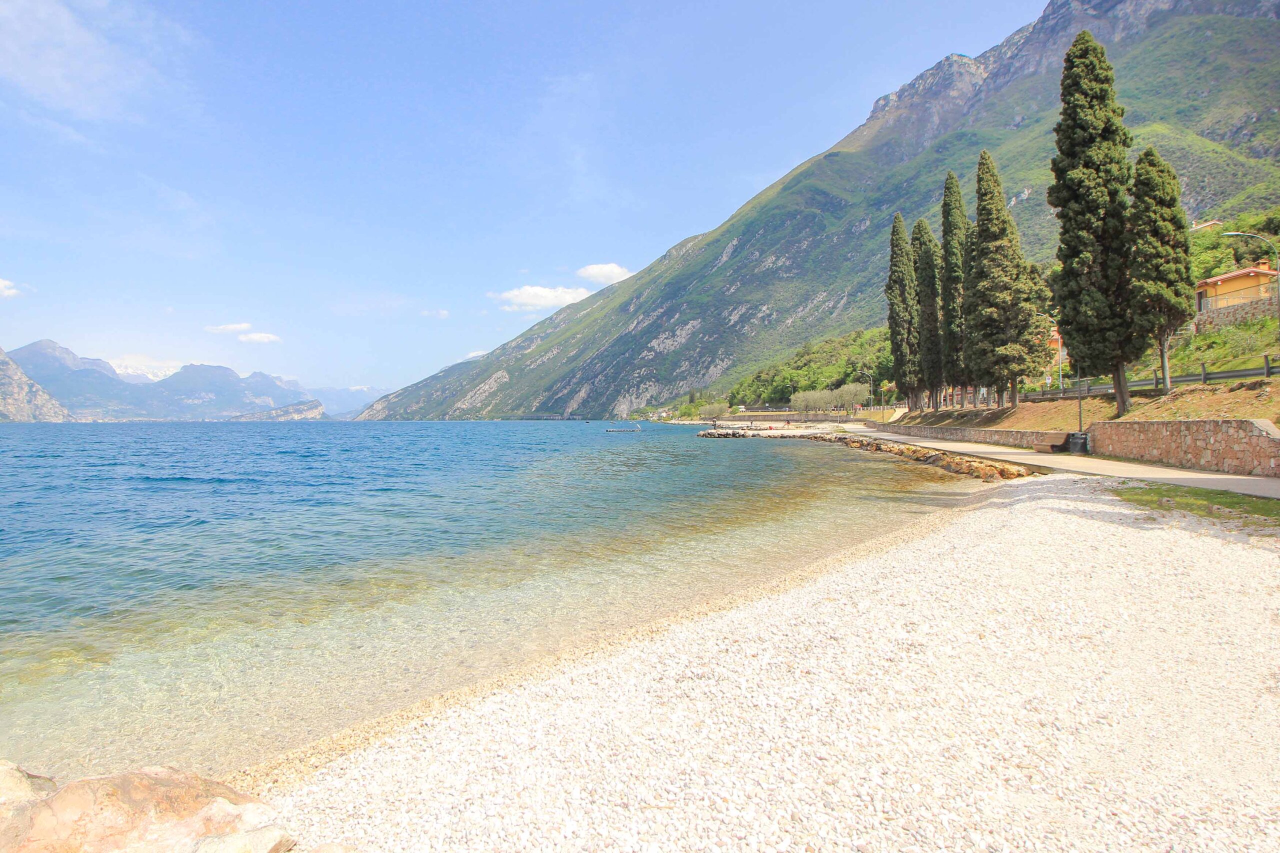 A fantastic beach for swimming in Malcesine is the Spiaggia Campagnola. This long and very well-kept pebble beach is located in the Campagnola district, about 4 kilometers north of the town center. It’s also easily accessible by bike along the promenade. The emerald-green color of the water is unique and, together with the high mountains, creates a picture-perfect setting. In addition, the lake is wonderfully clear, gently sloping and inviting for a swim! Families with children will feel at home here as well. Even in the high season, the beach at Campagnola is rather quiet. This guarantees a relaxing vacation at Lake Garda.
