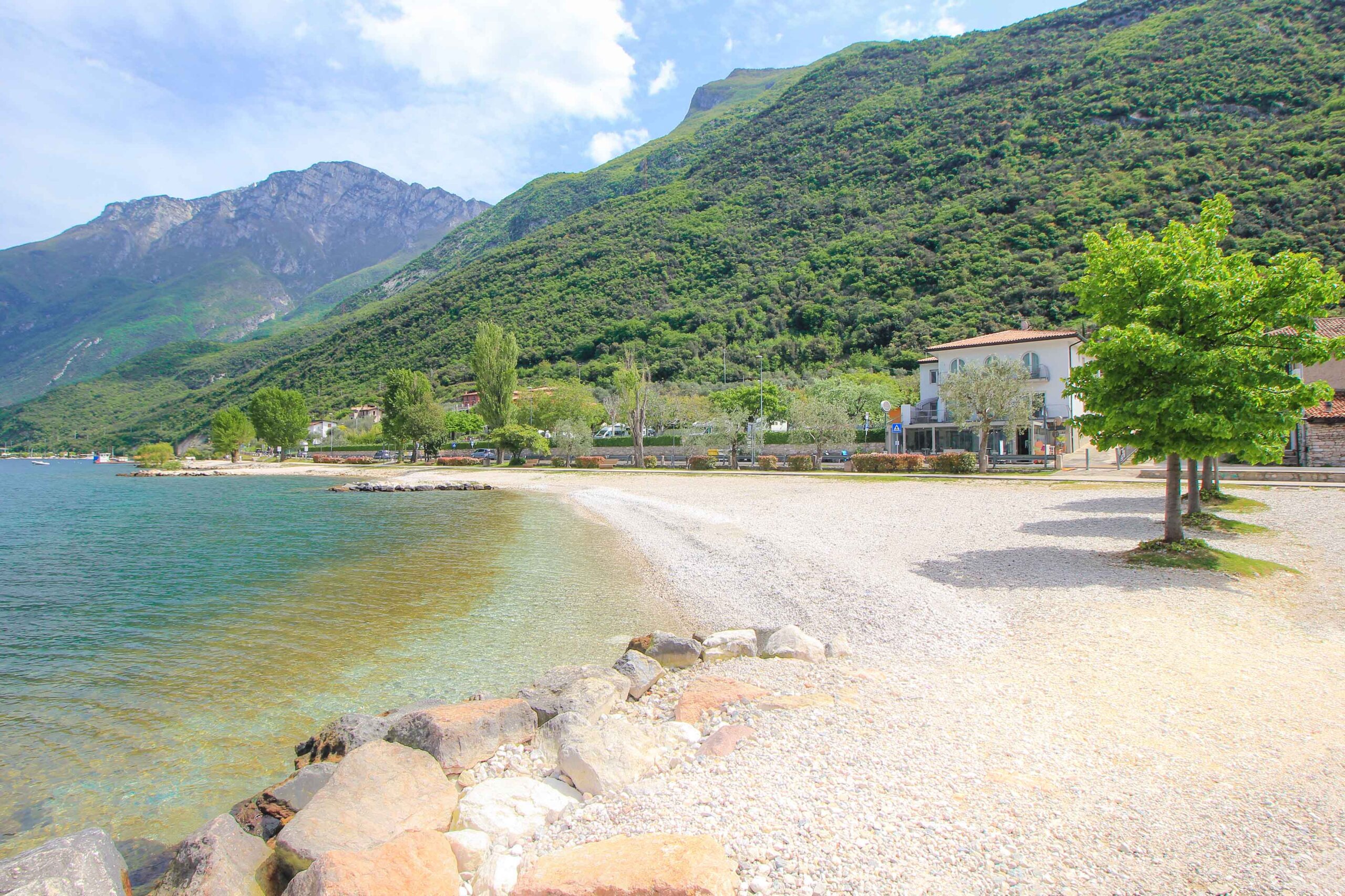 A very special recommendation near Malcesine is the Cassone Beach. This wonderful pebble beach is located at the beginning of the dreamy neighboring village of Cassone di Malcesine, just 4 kilometers from Malcesine, and is perfect for an unforgettable vacation on Lake Garda. The picturesque lakeside promenade is simply gorgeous, with several beautiful bathing spots offering an ideal entry point into the lake. The best place to eat and drink is in the picturesque town center, where you can relax in fantastic restaurants and cafés. Parking is available just behind the beach!