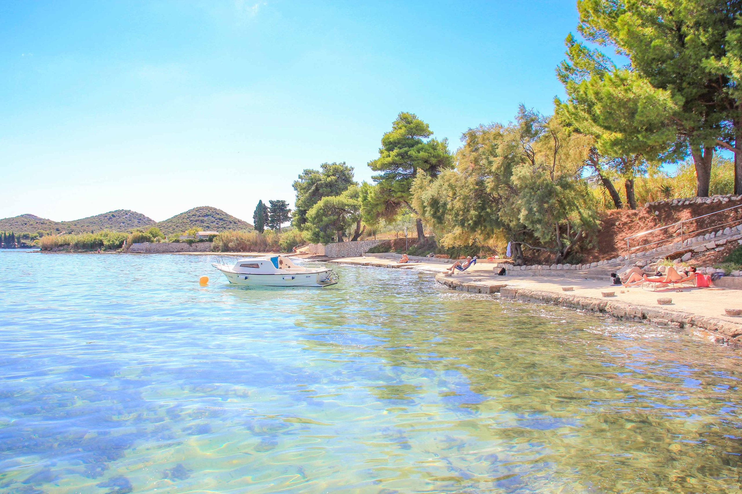 A popular beach on Pasman is the charming Plaza Glavicine. This small, hidden cove is located in the very south of the island, not far from the well-known village of Tkon. The entire beach ambience is truly picturesque, and hard to beat for idyll and charm. The beach is surrounded by Mediterranean vegetation, and the pine trees provide pleasant shady places. Around the bay there are concreted sunbathing areas, where stairs also lead into the sea. But simply incredible are the blue sea colors, which make for an almost kitschy setting. This beach is also ideal for snorkeling because the water is clear, and you can observe numerous fish there.