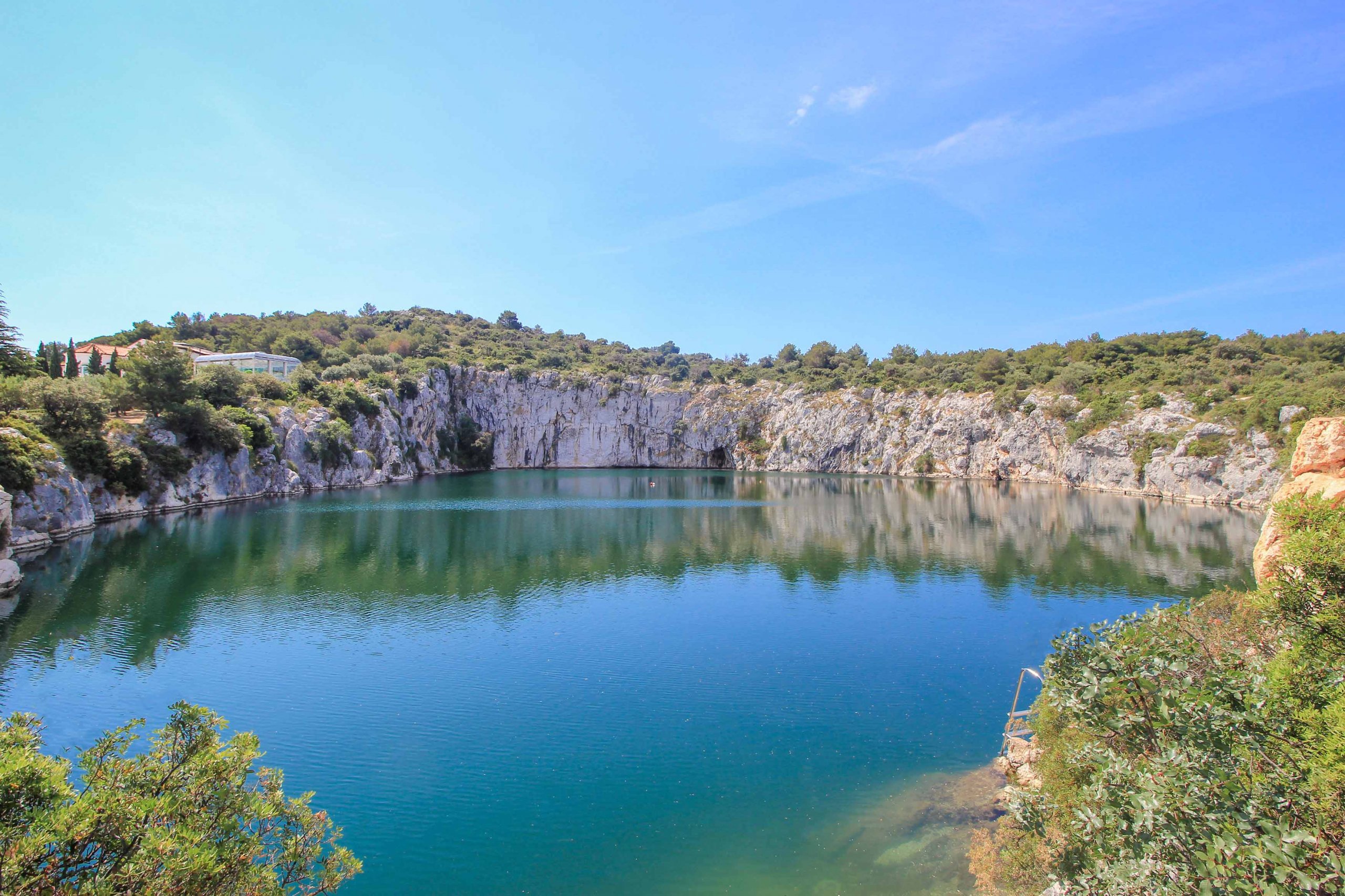 The Dragon’s Eye Lake, also known as the “Eye of the Dragon” or Zmajevo oko, is definitely the most important attraction in Rogoznica! It is located directly behind the marina, nestled in beautiful nature and surrounded by rock walls up to 24 meters high. This spectacular natural jewel probably owes its mystical name to its oval eye shape, but also to the legend, according to which a dragon is said to live in the lake. The depth of this azure lake is almost 60 meters and its water level rises and falls with the tide.