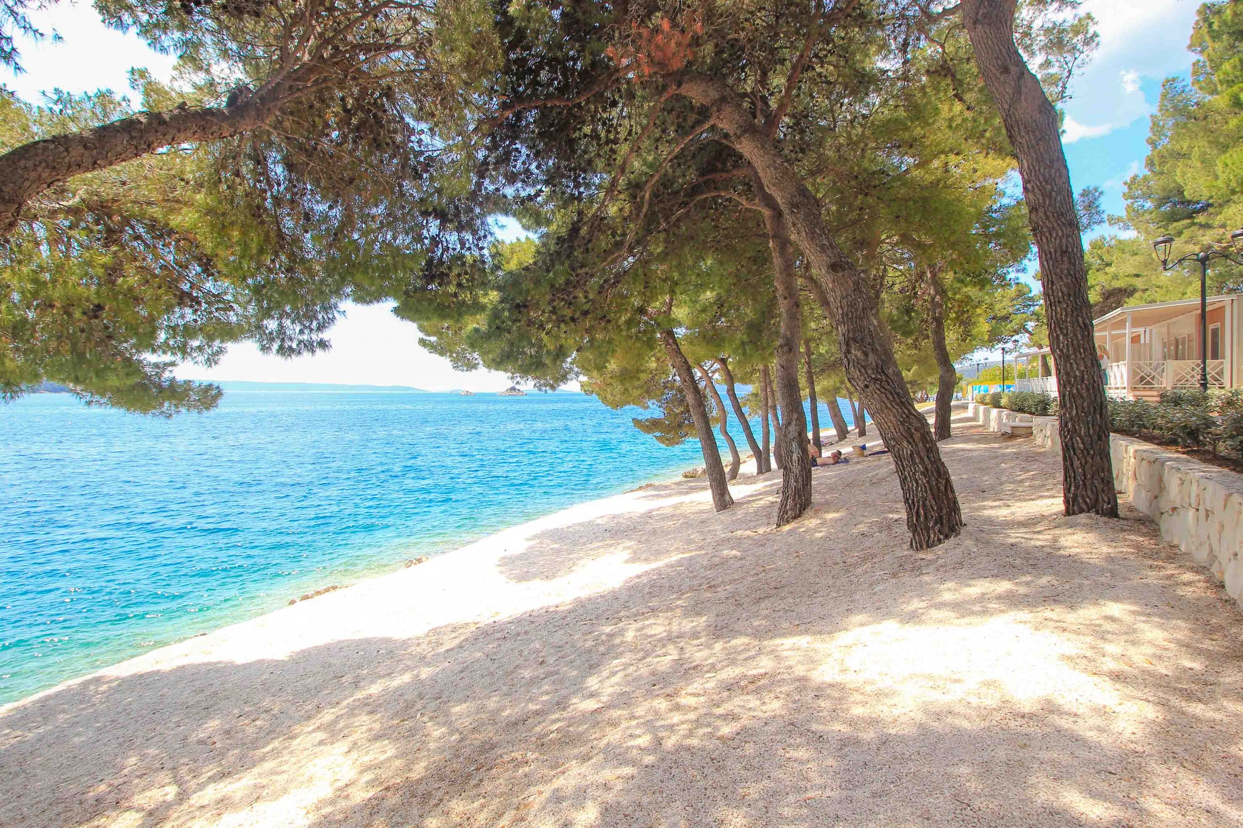 The dream beach Plaza Vranjica is the main beach of the resort. This approximately 300 meter long stretch of coastline has been divided into several small bathing bays and is particularly impressive because of its idyllic ambience. The sea slopes relatively shallowly at this beach, which is especially appreciated by families with children, as well as non-swimmers and older people. While bathing, you can enjoy the crystal clear turquoise sea and also the view of the charming white coastal town is phenomenal. The pretty shady trees directly on the beach give Plaza Vranjica a unique Mediterranean touch.