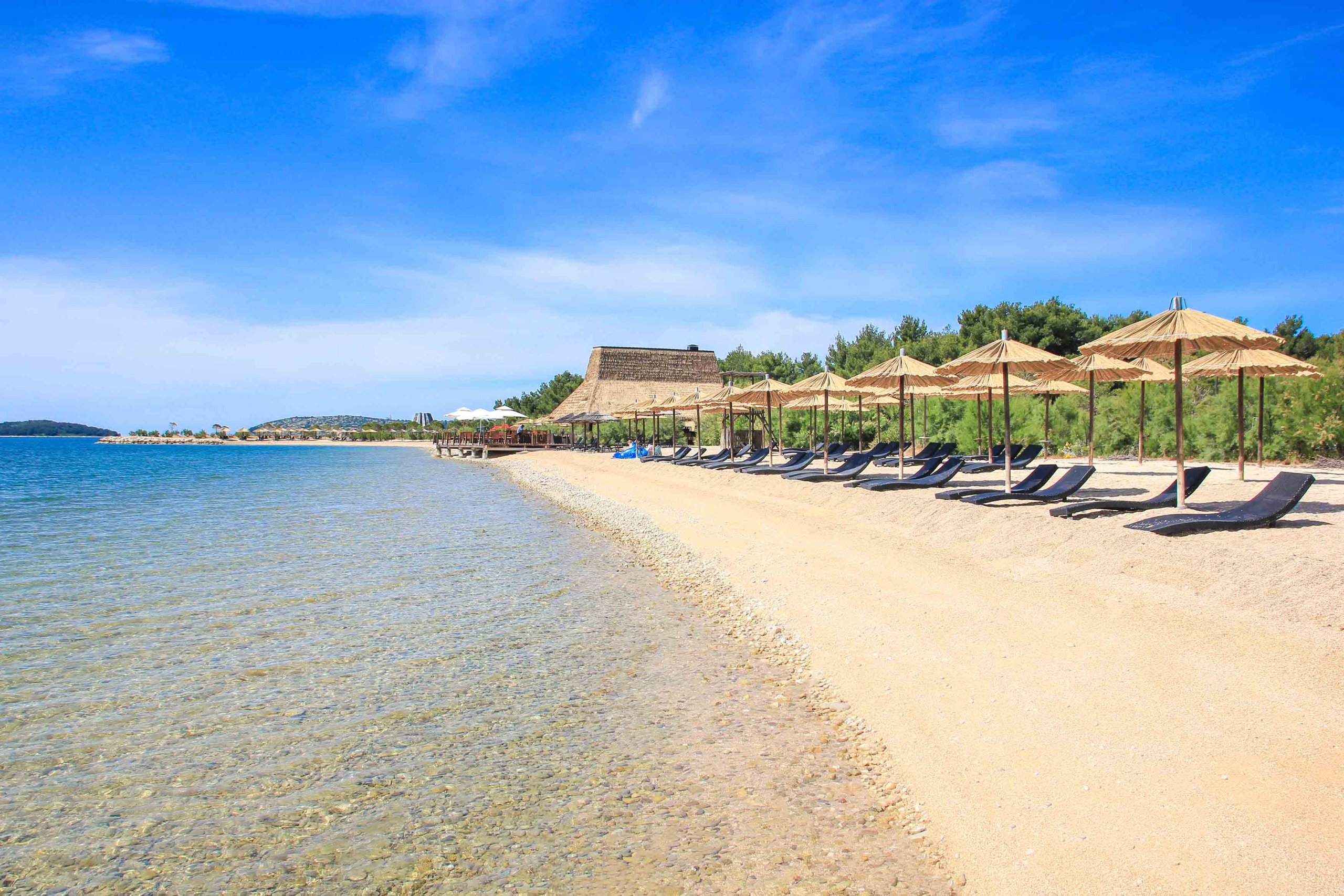 One of the most beautiful beaches in Sibenik is definitely White Beach, a real dream bay about 7 kilometers from the old town. This beach is part of the Amadria Park holiday complex, but can of course also be visited by non-hotel guests. Here, you experience a spectacularly stunning mix of pebble and sandy beach, which forms a fascinating panorama with the turquoise blue sea. The holiday feeling is phenomenal and families with children as well as couples and singles feel right at home here. There is hardly any natural shade, but comfortable sun loungers with parasols are available for rent. The tourist offer at White Beach is also perfect. Several restaurants, cafés, a kiosk and a pretty sweets shop provide guests with drinks, food, and treats.
