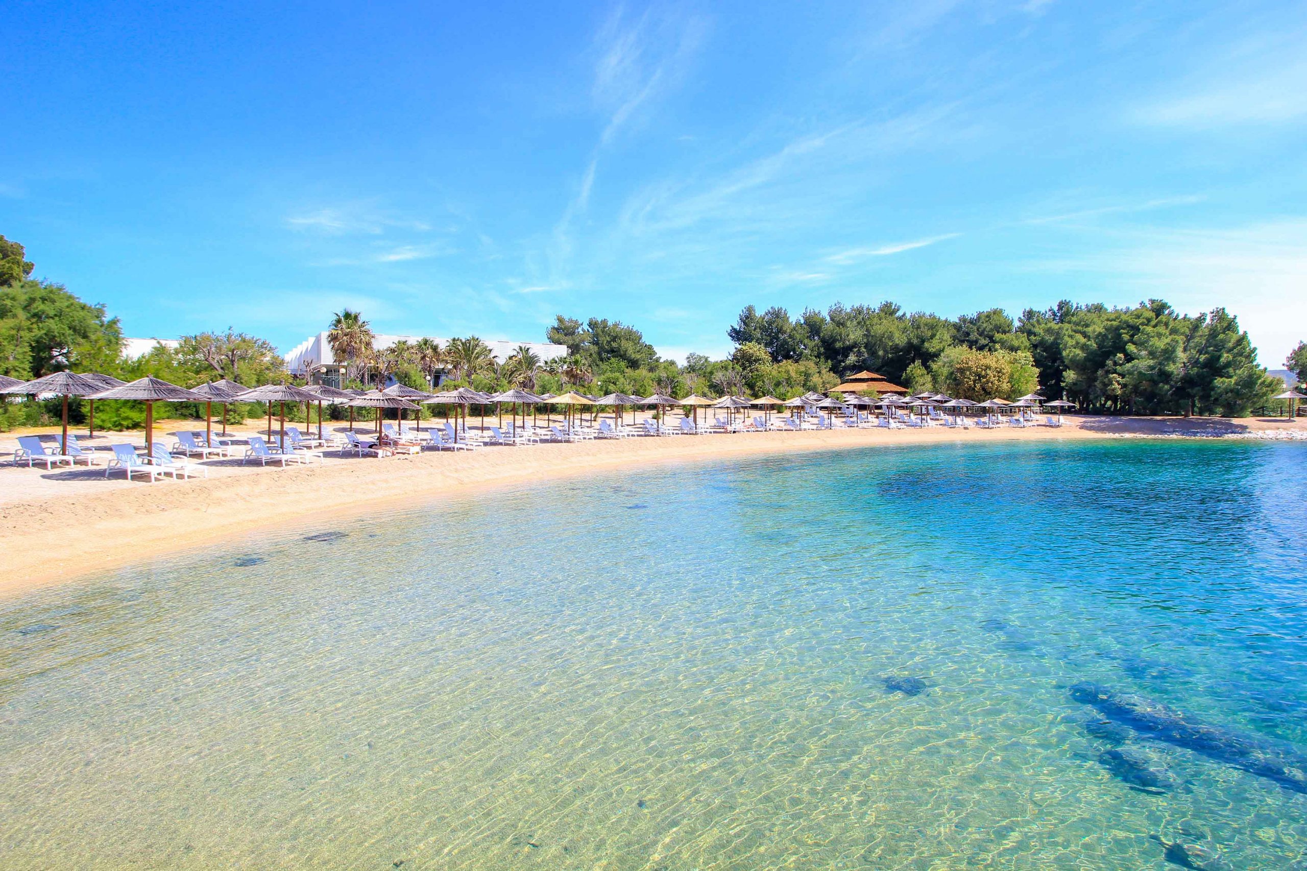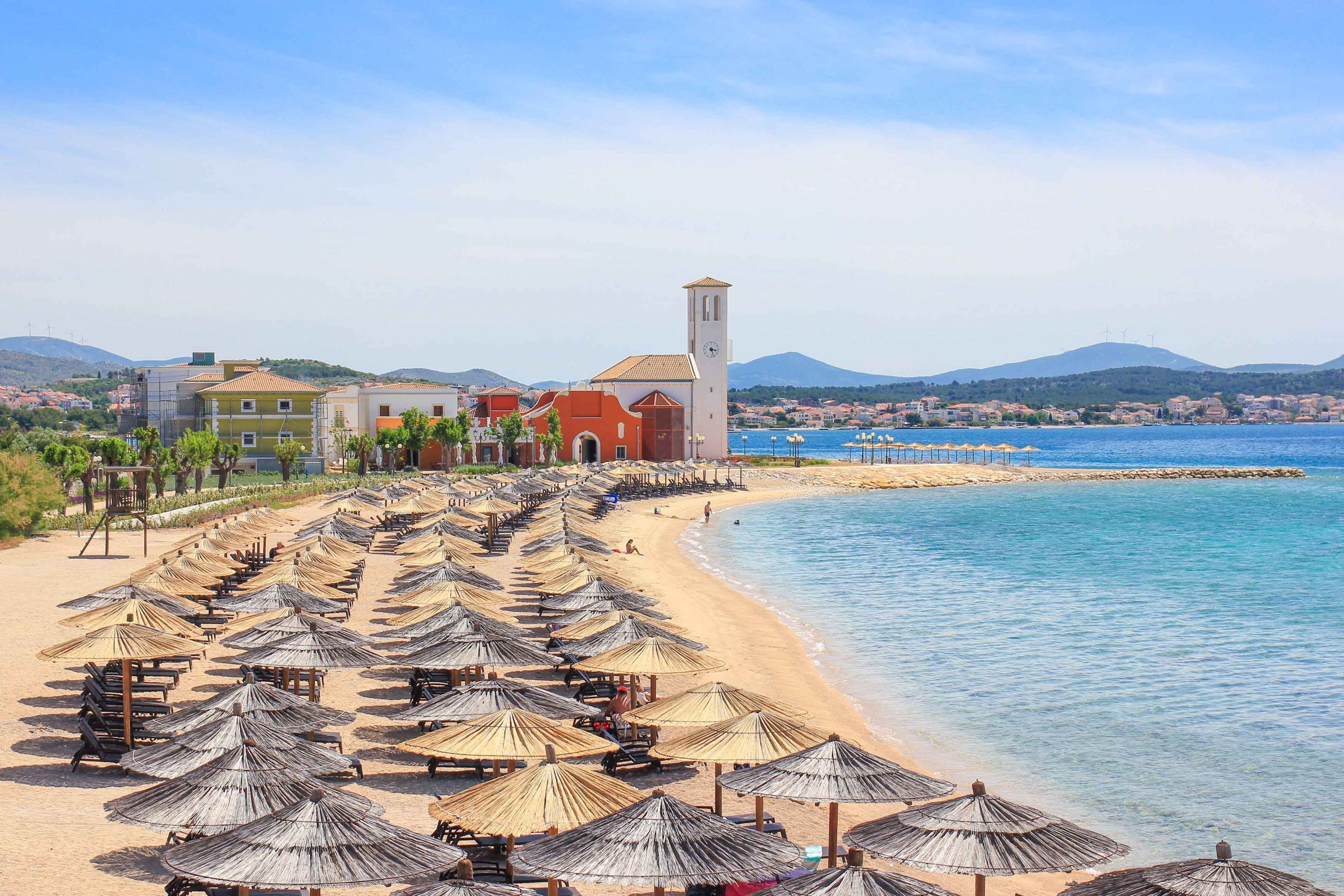Absolutely popular and only 14 kilometers away from Sibenik City is the holiday resort Vodice. This destination with its pretty old town and many fantastic beaches is a great choice for a beach holiday at the Sivenik Riviera. Here, you will be spoiled because along the coast of Vodice there are several dream beaches that delight with a perfect mix of sandy beaches and pebble beaches. The turquoise-blue sea colors are also unique and give this region a Caribbean touch. The main beach is Male Vrulje, where you will encounter many cool beach clubs and restaurants. The Hotel Olympia Sky with its sky bar and infinity pool is also located on this famous beach.