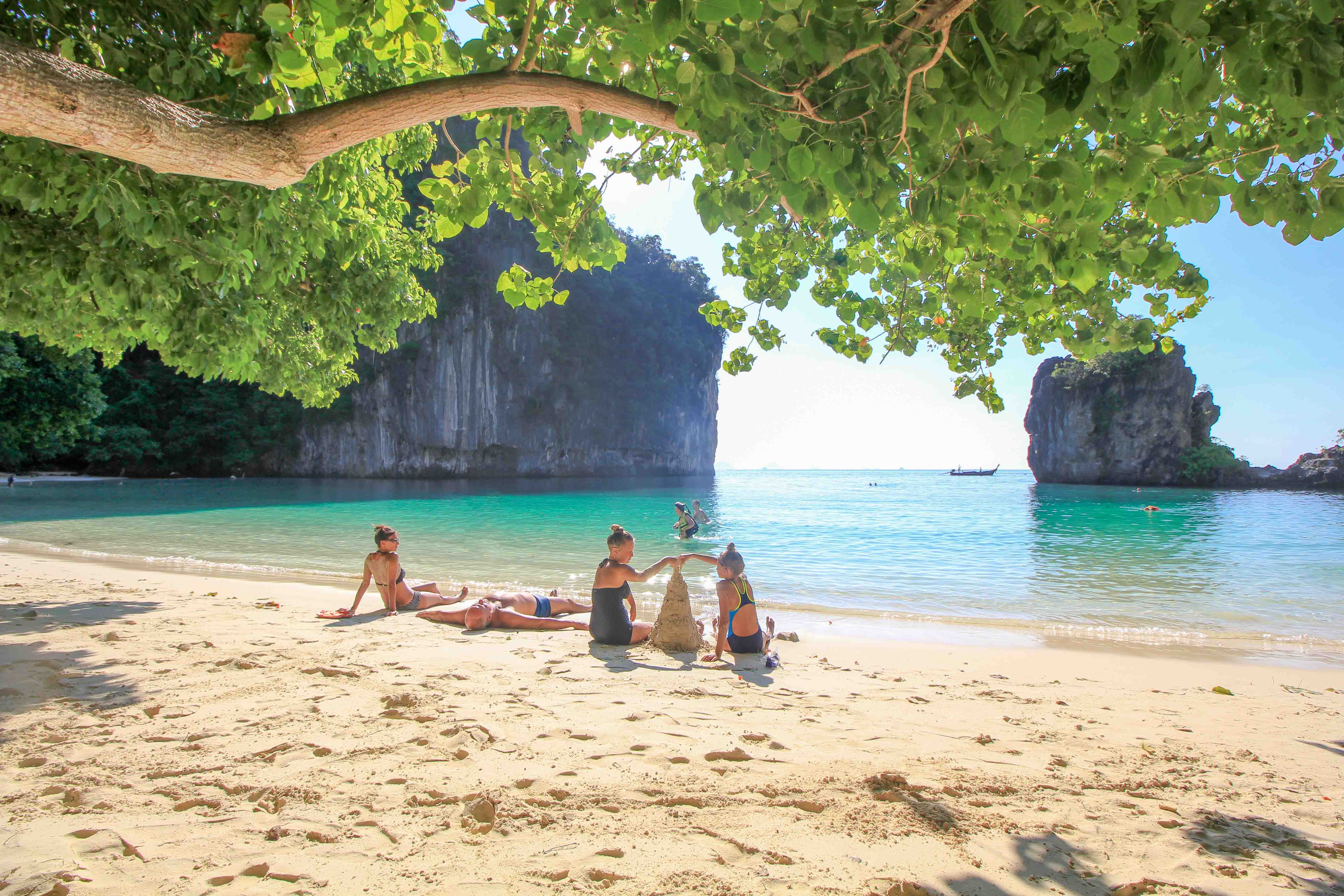 Railay Beach is a peninsula, but since the bay is separated from the mainland by deep jungle and can only be reached by longtail boat from Krabi town or Ao Nang, you immediately get a real island feeling. In addition, many small offshore islands await you here, which you can reach via a short trip with the longtail boat on a 4 Island Tour. The gigantic limestone rocks, the jungle, the breathtaking Phra Nang Beach and the beautiful Railay Beach offer an unbeatable ambience. A real paradise for beach lovers, but also for climbers!
