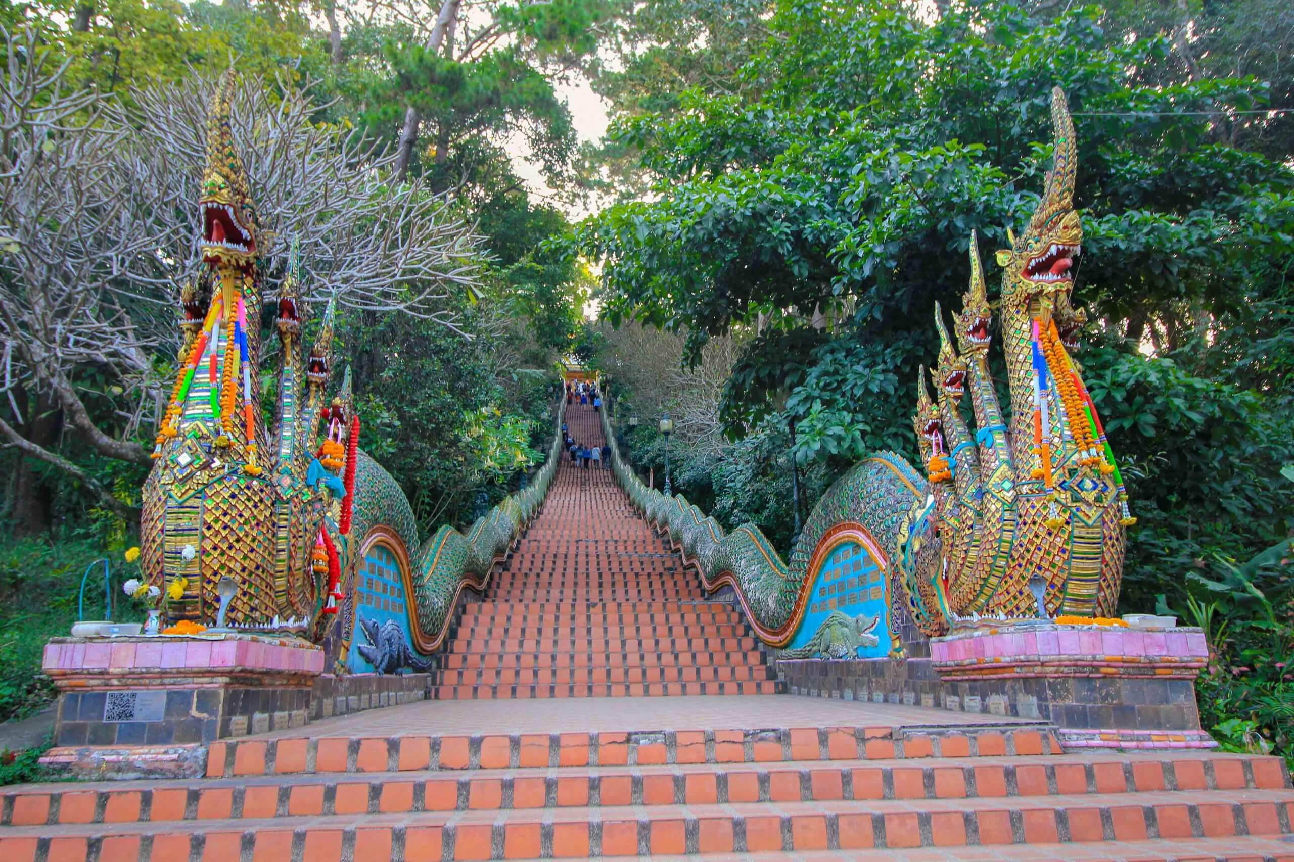 A visit to Doi Suthep National Park, with its famous temple Wat Phra That Doi Suthep, is one of the best things to do in Chiang Mai. This beautiful nature attraction is located in the forested mountains above Chiang Mai, about 15 kilometers from downtown. The highlight of this park is the impressive temple complex of Wat Phra That Doi Suthep, which can be reached by climbing 309 steps and which thrills with a beautiful view over Chiang Mai and with wonderful golden Buddha statues. However, there is even more to discover in the national park. Especially worth visiting are the royal palace complex Bhubing Palace and the Hmong Village, a charming mountain village in the north of Chiang Mai.