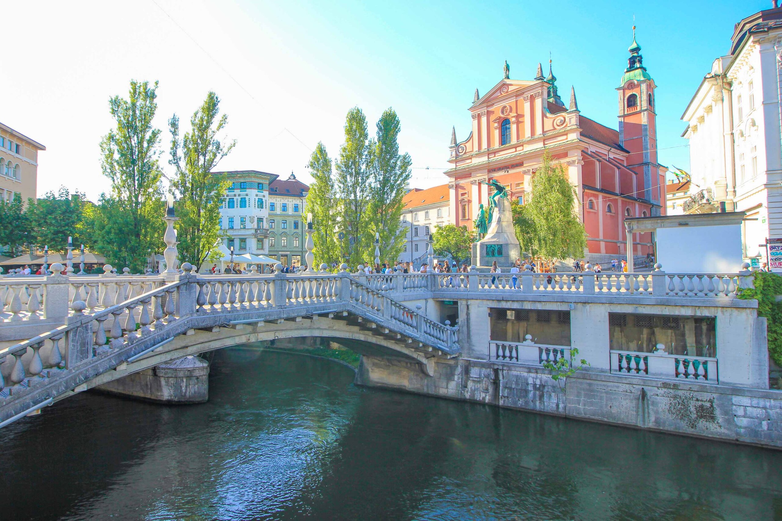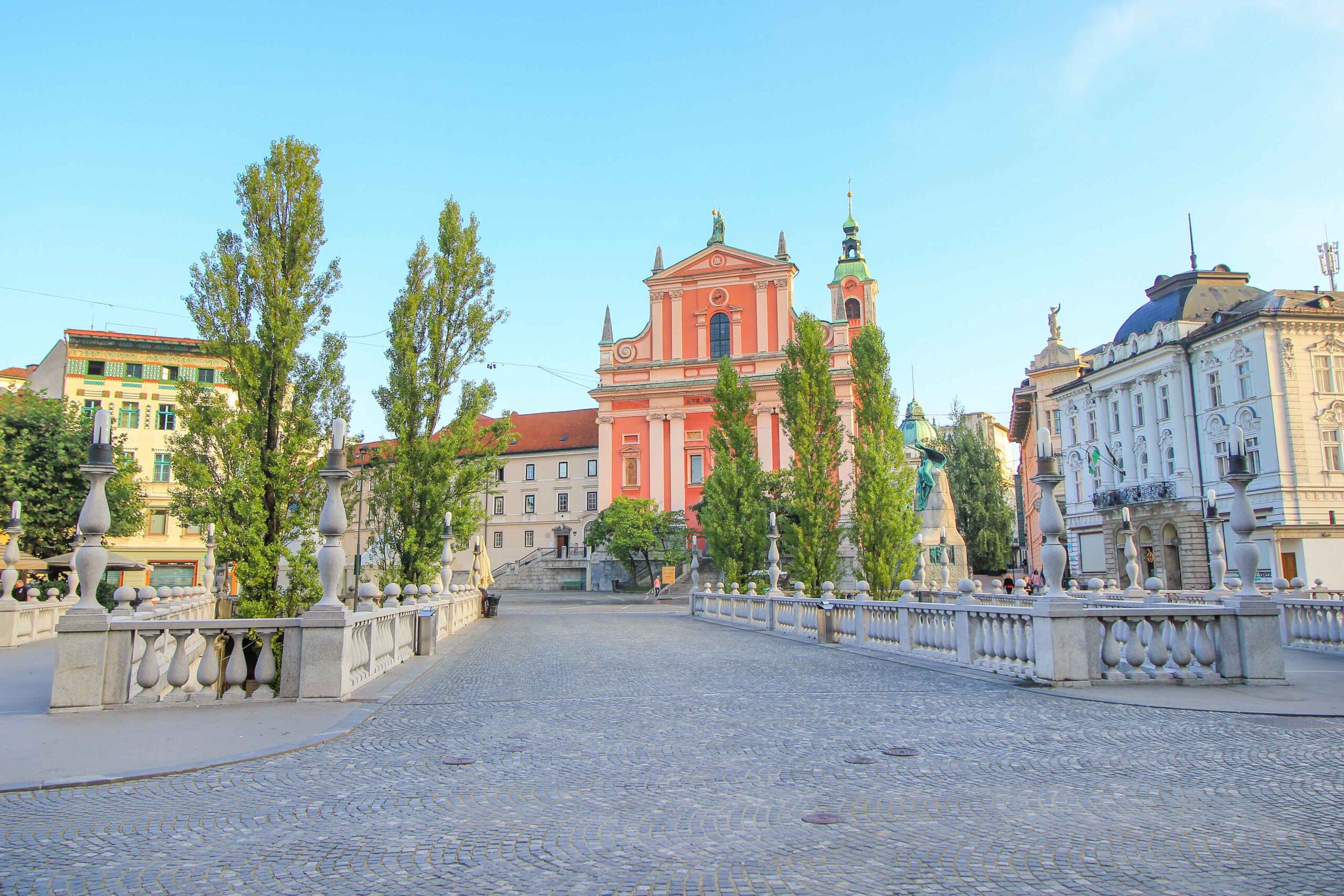 The magnificent Prešeren Square, also known as Prešernov trg, is the city’s main square and certainly a visit one of the most famous things to do in Ljubljana. It is the vibrant heart of the city center and a popular starting point for sightseeing in the center and exploring the Old Town. Preseren Square was named after the national poet Frank Prešeren, whose statue can be admired on the square today and is a popular photo motif. The 17th-century Franciscan Church of the Annunciation is also a major attraction, and together with the legendary Triple Bridge of Tromostovje, it offers a picturesque panorama of Ljubljana.