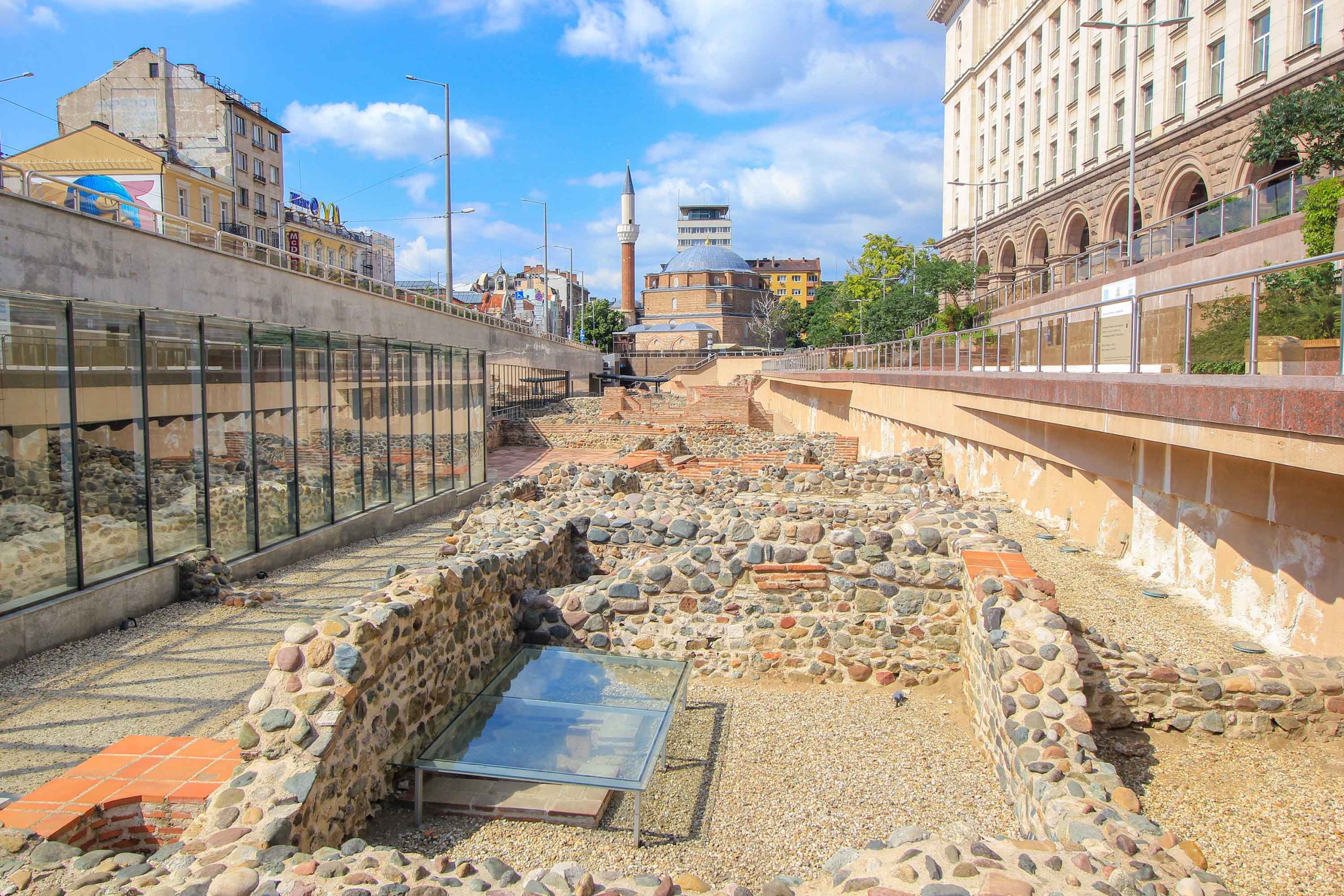 A visit to the Ancient Serdica Archaeological Complex is one of the best things to do in Sofia. This excavation site is located right next to the Serdica metro station, just near the small Sveta Petka church. During a tour, you will be amazed by the remains of the Roman city of Serdica, which dates back to the 2nd century. The most beautiful is the spectacular ensemble of Roman excavation site, modern architecture and the classical town houses, as well as the famous Banja-Baschi mosque in the background. Part of the ruins is located under a modern glass structure, while another part is completely exposed between the Sveta Petka church and the metro station. Both areas can be visited for free!