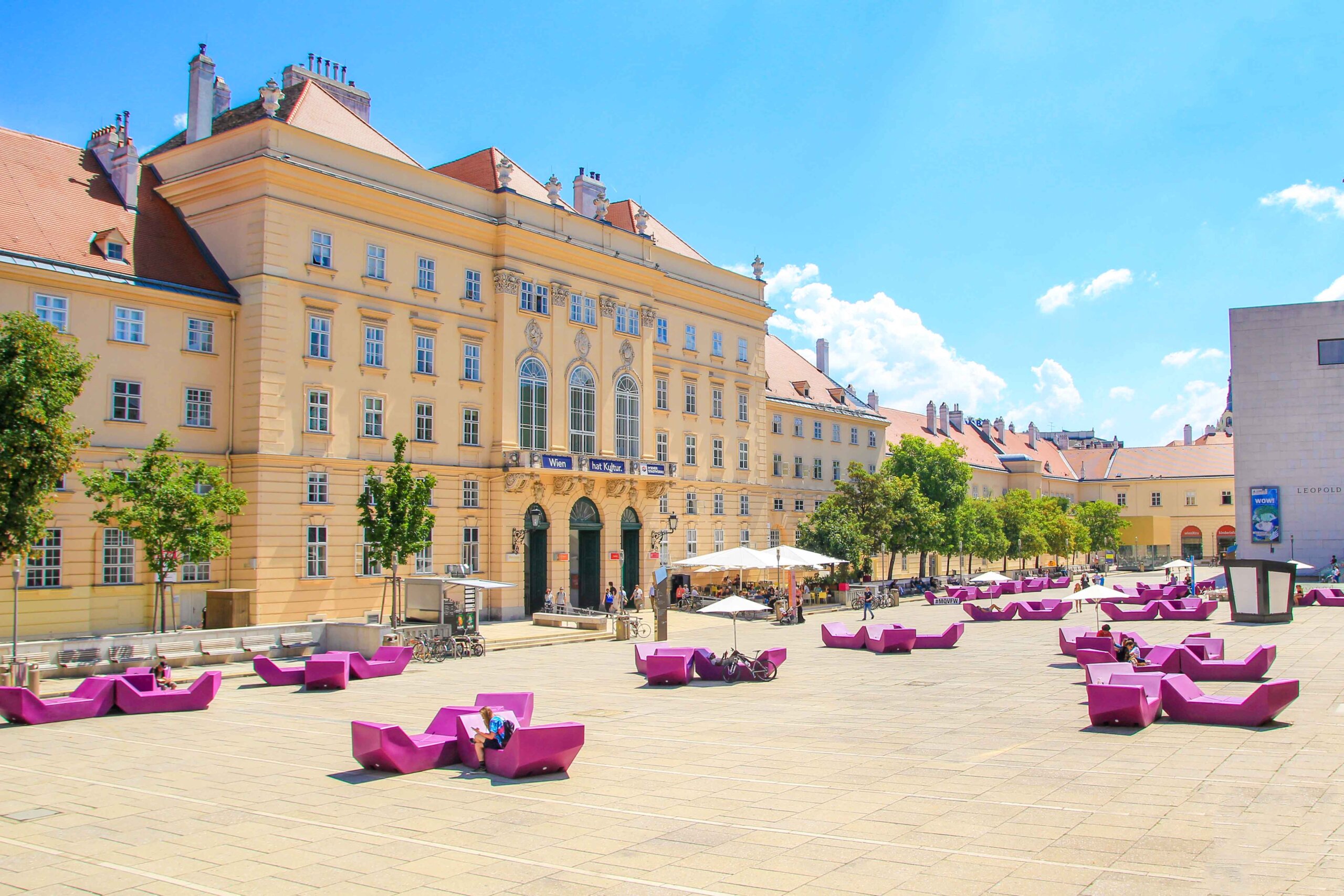 The MuseumsQuartier Wien, also known as MQ, is a fascinating art district in Vienna’s trendy 7th district of Neubau, close to the Vienna Ring Road in the city center. It is home to some of Vienna’s most interesting museums, including the Leopold Museum, which houses hundreds of masterpieces of Viennese modernism, and the mumok – Museum of Modern Art Ludwig Foundation Vienna. The MQ is not only home to exciting museums, but also a trendy bar scene and cool events. Another unique feature of the MuseumsQuartier is the inner courtyard with its modern outdoor lounge furniture, which has become a popular meeting place.