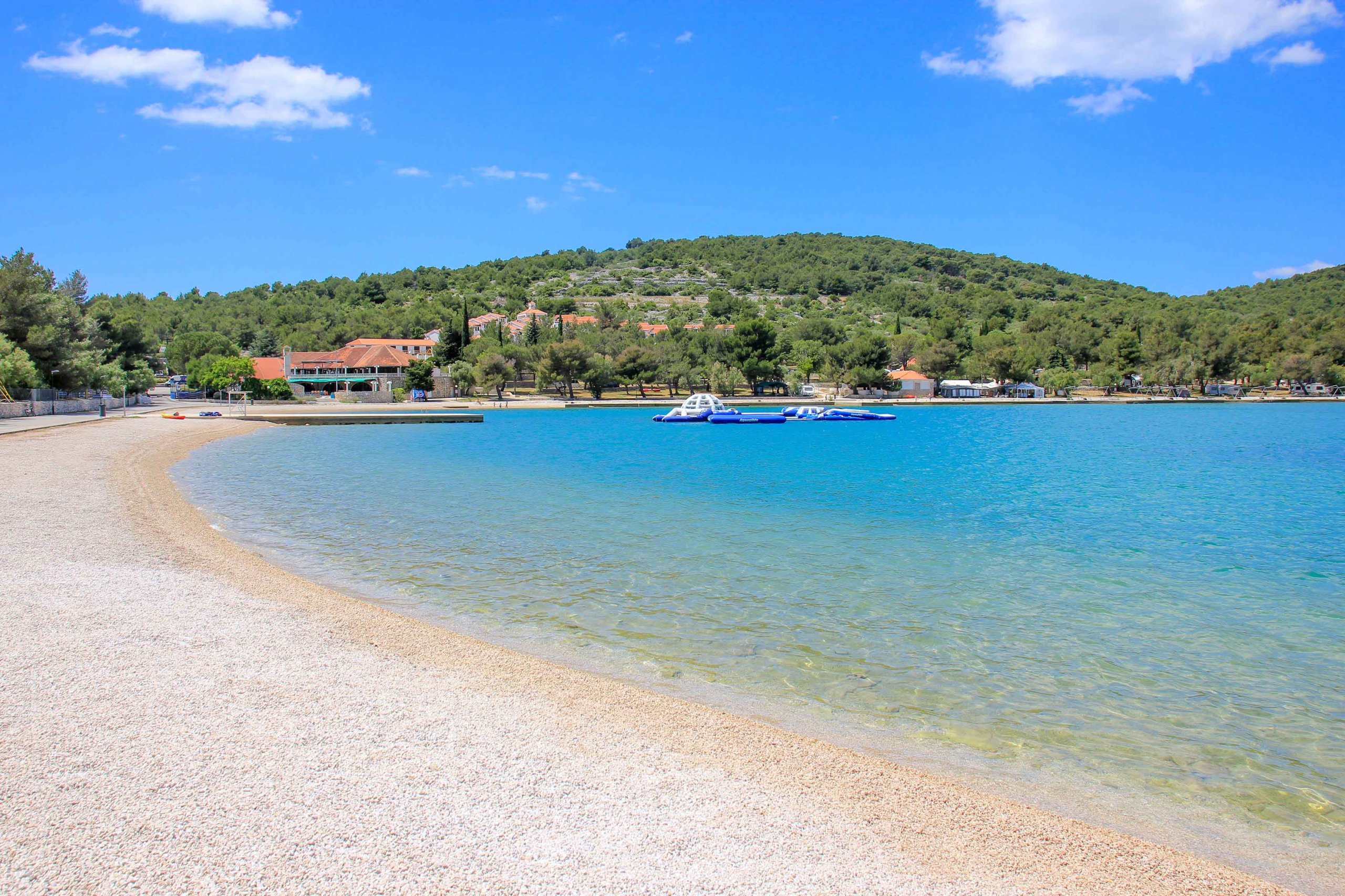 Lovisca beach belongs to the Jezera Village Lovisca camp of the same name and is another very popular bathing beach near Tisno. You can reach it on foot along the coastal promenade in the direction of Betina, or by car. Campers in particular, but also families with children, love this gently sloping pebble beach, which scores with fabulous facilities, terrific holiday flair and many entertainment options such as a water bouncy castle and pedal boat rental.