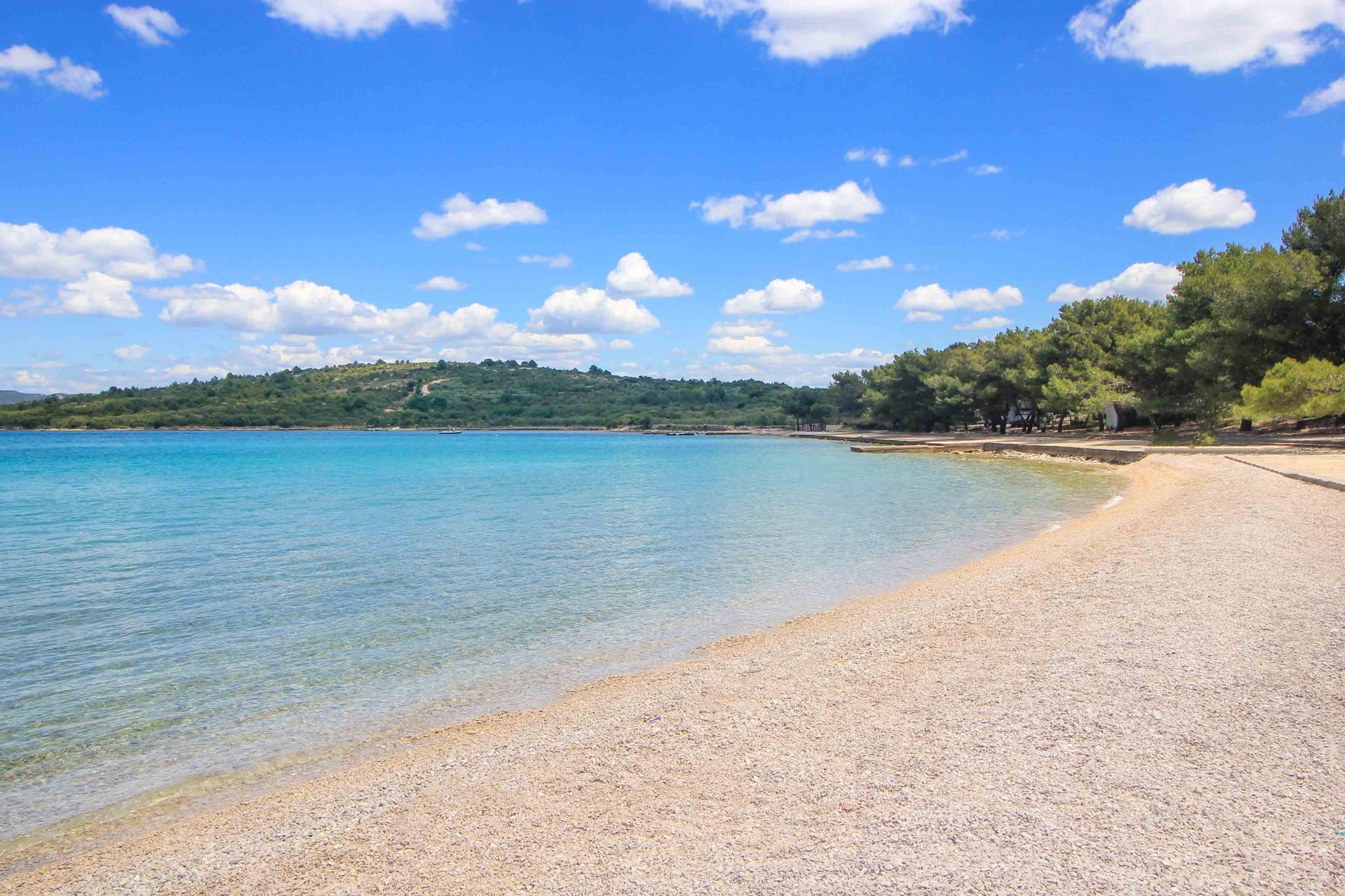 Another beautiful beach in Tisno is Jazina beach. It is located at Jazina campsite on the mainland of the resort. Especially families with children, but also non-swimmers love this shallowly sloping pebble beach because even the smallest ones can splash around in the crystal-clear sea safely. The adjacent pine forest is also really pleasant and provides cool shade, especially on hot summer days.