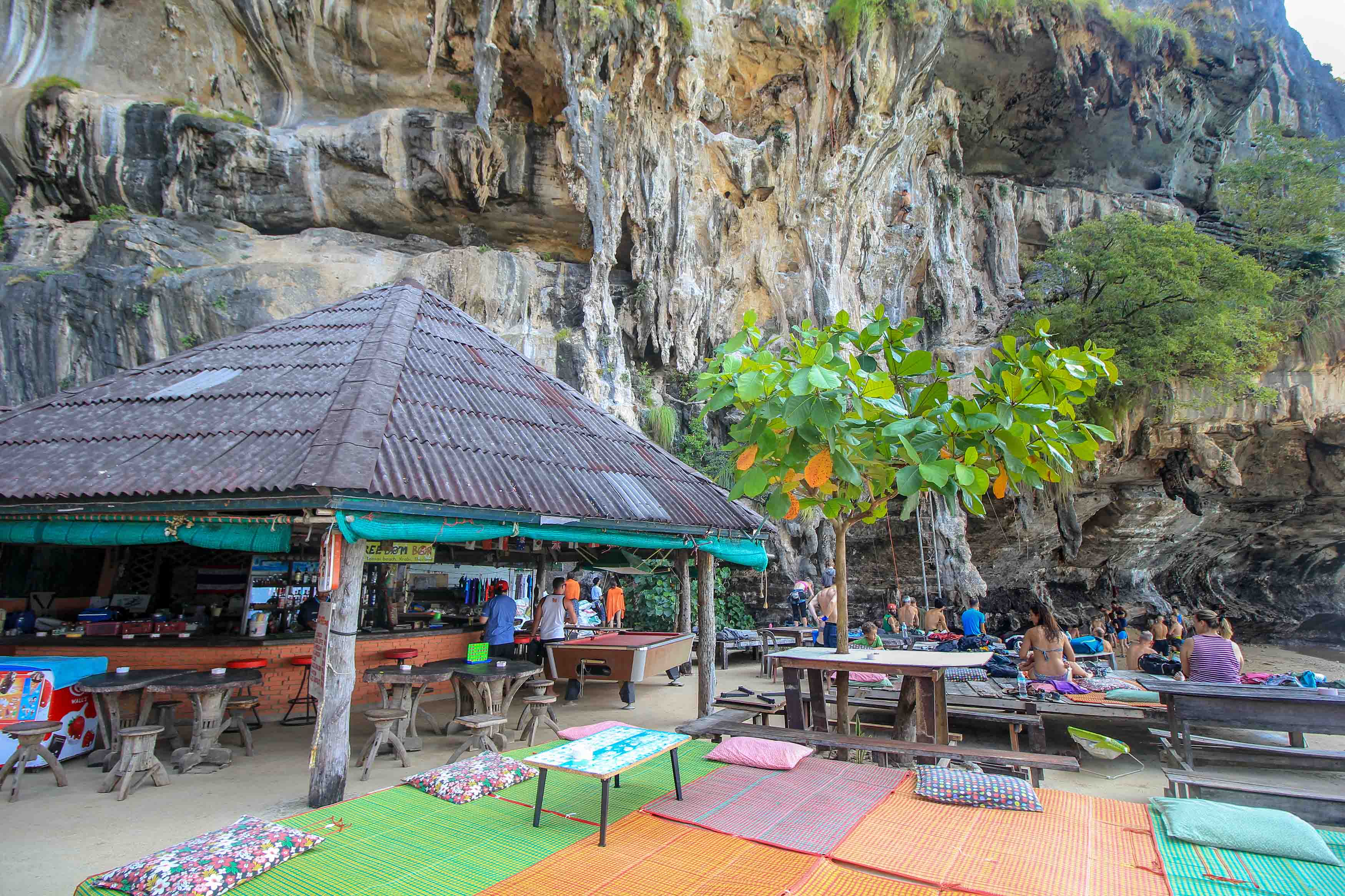 Compared to the neighboring beaches like Railay Beach and Ao Nang Beach, Ton Sai is a lot less crowded. One thing is for sure, here everyone will catch an undisturbed place under the sun. For a cold beer, backpackers and travelers meet at the legendary Freedom Bar, right at the top of the beach. The atmosphere and the magnificent view of the spectacular cliffs are unbeatable. That part of the beach is hosting the climbing scene, but more of it later.