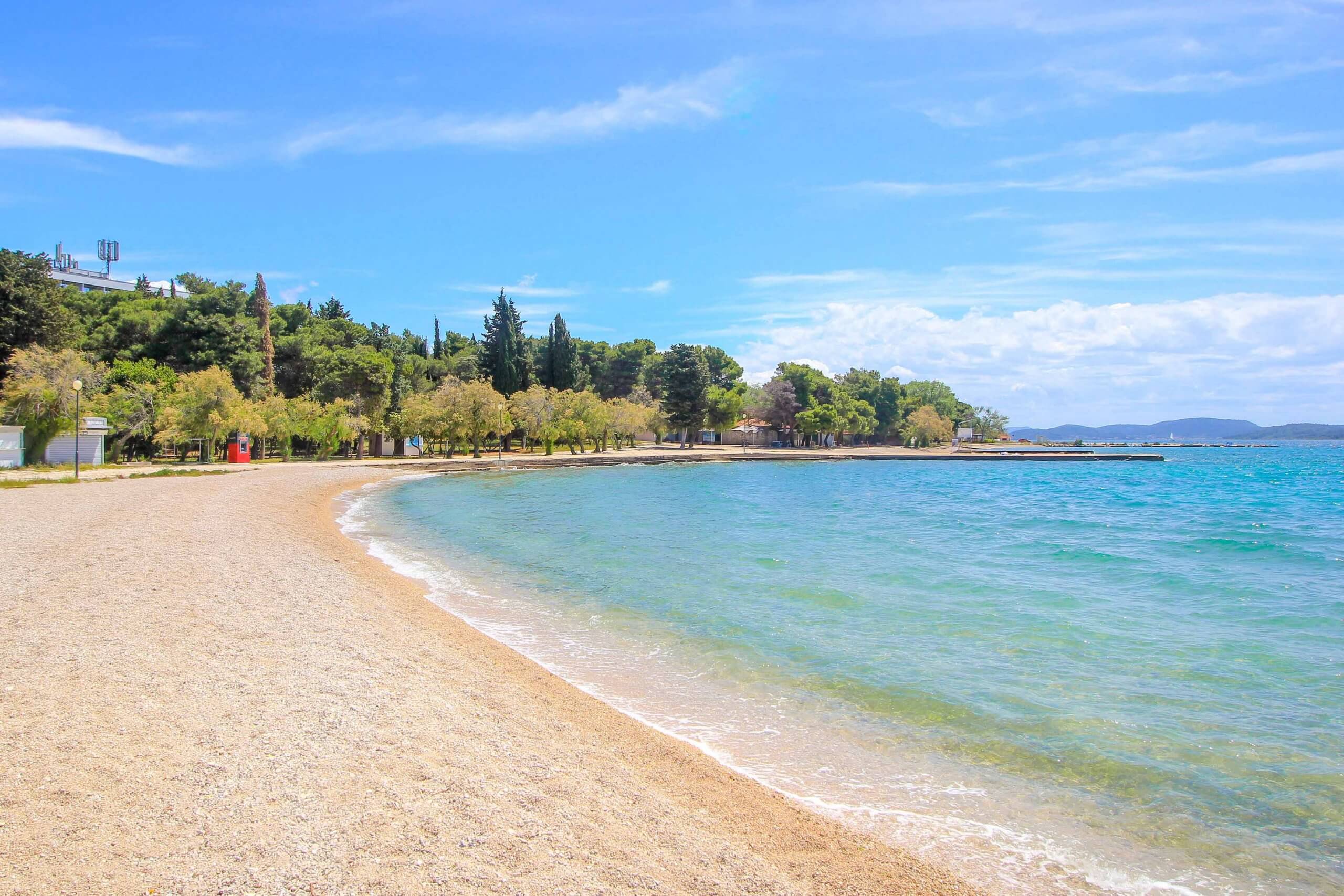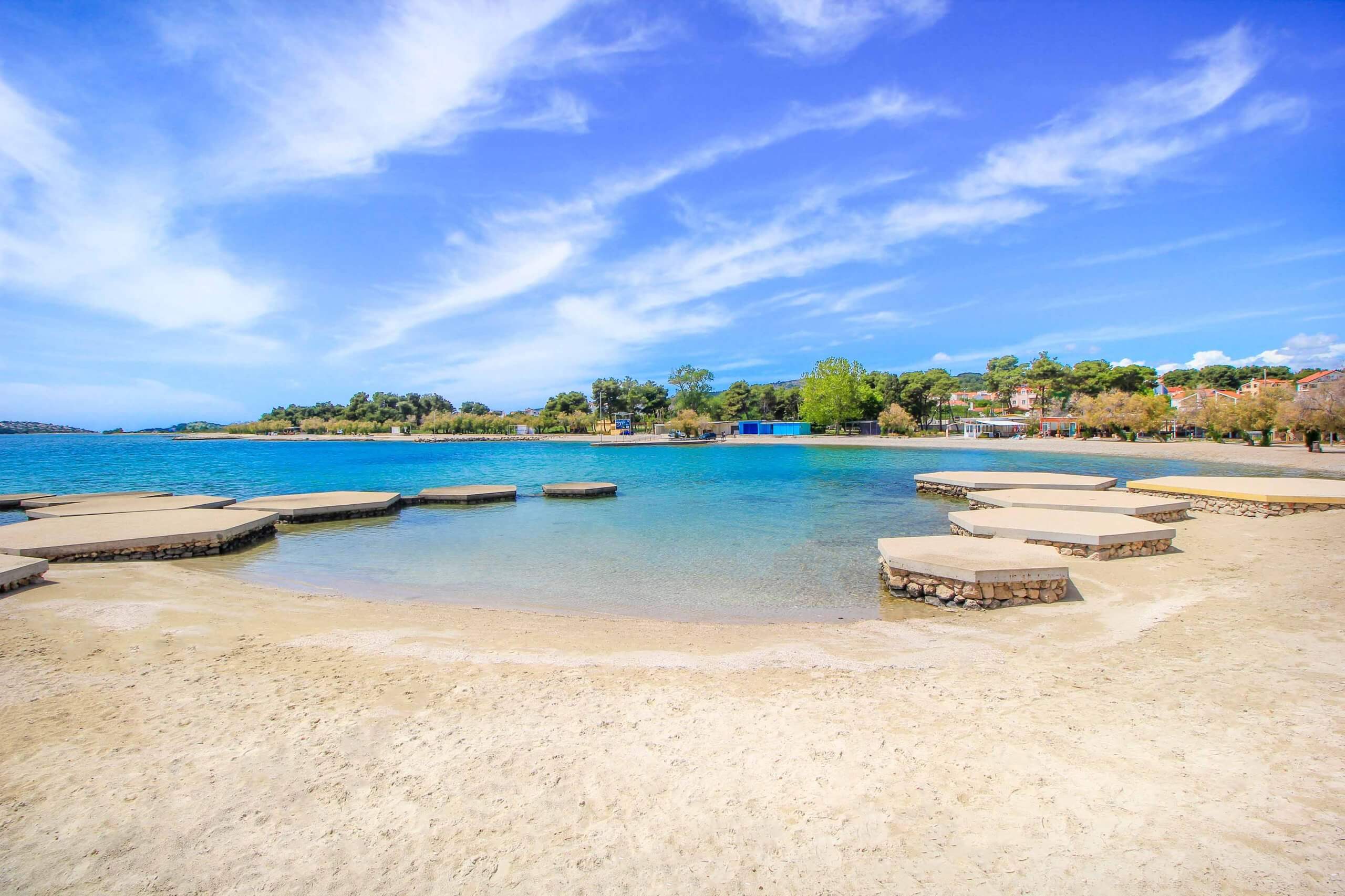 The main beach of Vodice is Male Vrulje, also called Plaza Hangar. It is located south of the center, directly below the harbor, and is certainly one of the most famous beaches in Vodice. This very popular 500-meter-long pebble beach was created as a kind of lagoon, where concrete sunbathing areas and bridges form an impressive and modern appearance. Shade is provided by the tall pine trees, which give this bay a Mediterranean flair. Well-frequented in the high season, this beach is quiet and relaxing in the low season.