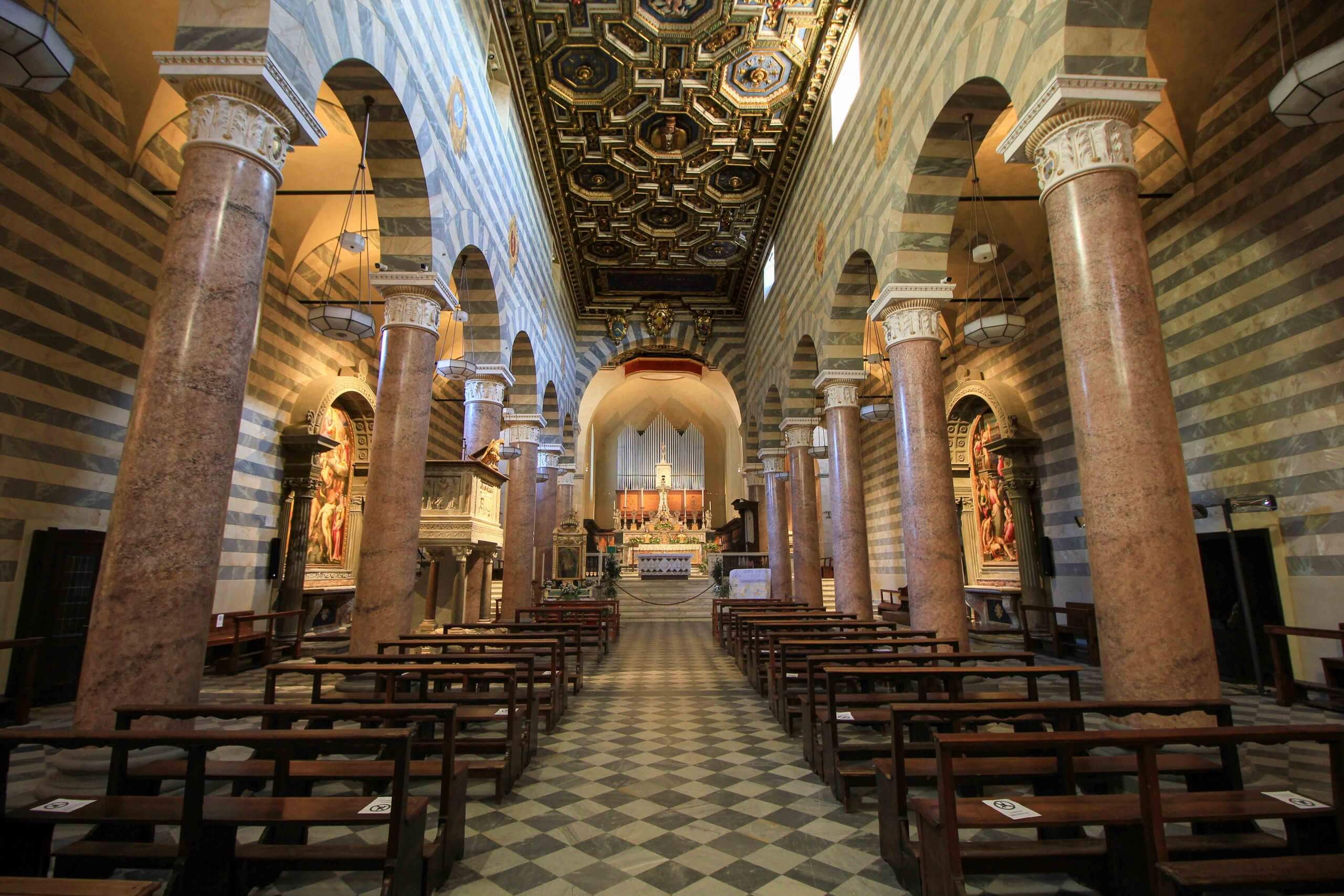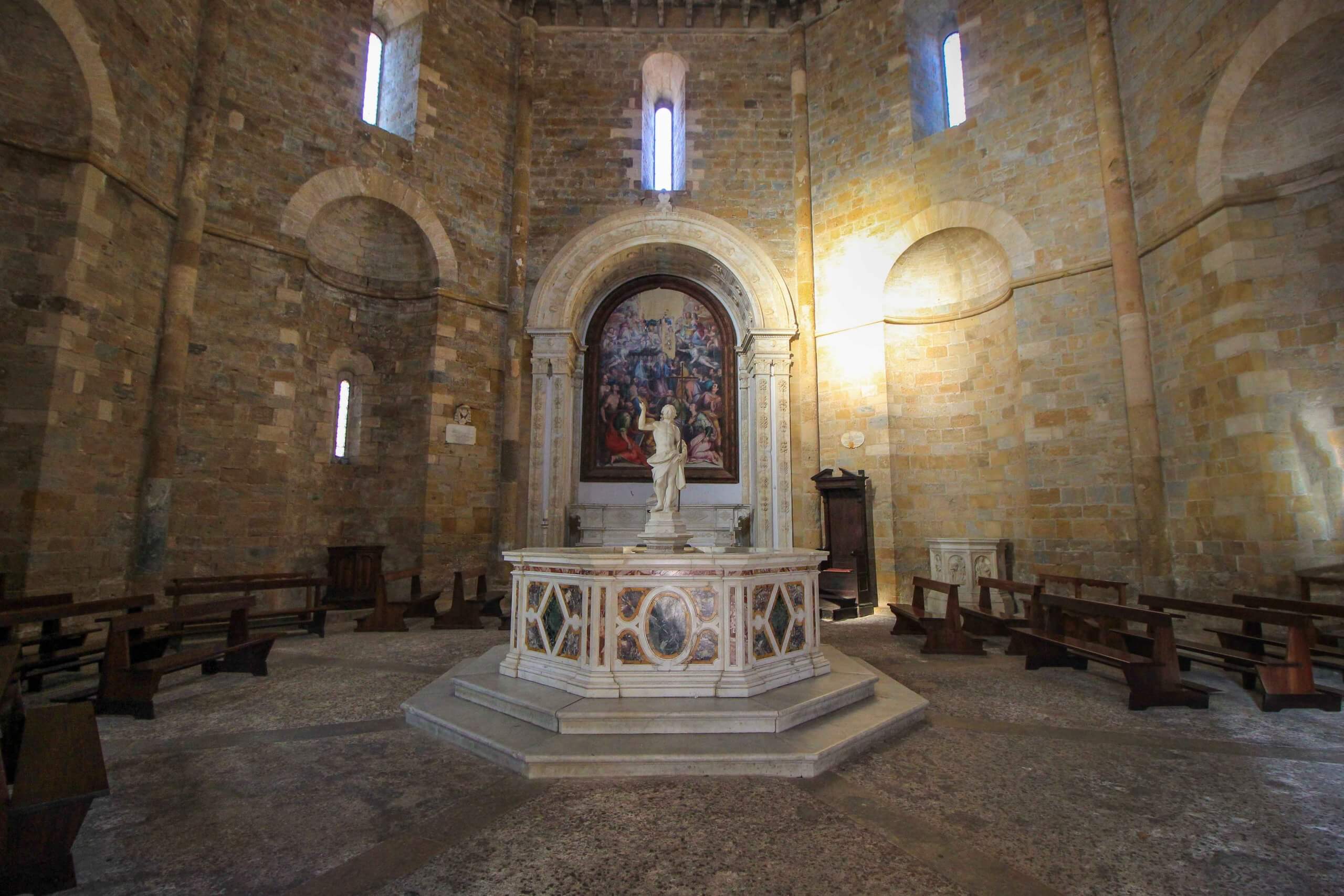 A beautiful attraction in Volterra is the Cathedral, also known as the Cathedral of the Assumption of the Virgin Mary. The history of this church dates back to the 9th century. It had to be rebuilt after an earthquake in 1117. From the outside it is somewhat inconspicuous, but from the inside it is a real highlight. Here you will find impressive frescoes, paintings and precious green and white marble and alabaster works from the region. Just opposite is the Baptistery, an octagonal baptistery from the 12th century, which like the cathedral can be visited free of charge.