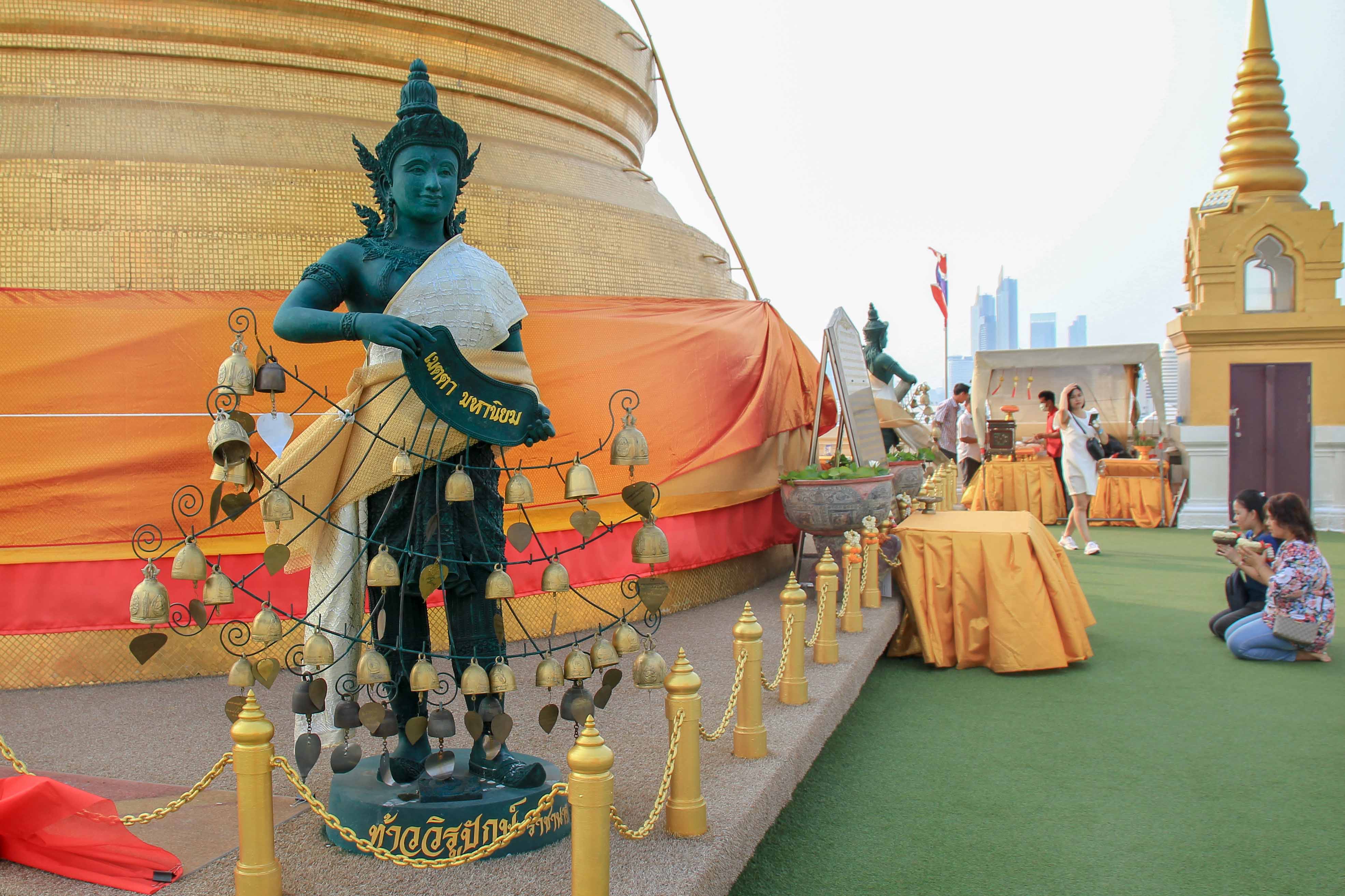 At the top, the mood is just magical! Such an outstanding place of peace and quietness. Only the small bells ring in the wind, and only the monks’ prayer ceremonies can be heard out of the speakers. A large golden chedi is located right in the middle of the upper platform, and you can watch the faithful as they circle them with their offerings. The meditative silence invites to linger for a while, so make sure you take your time for the visit. Without a doubt, the absolute highlight of the temple is the brilliant view all over Bangkok.